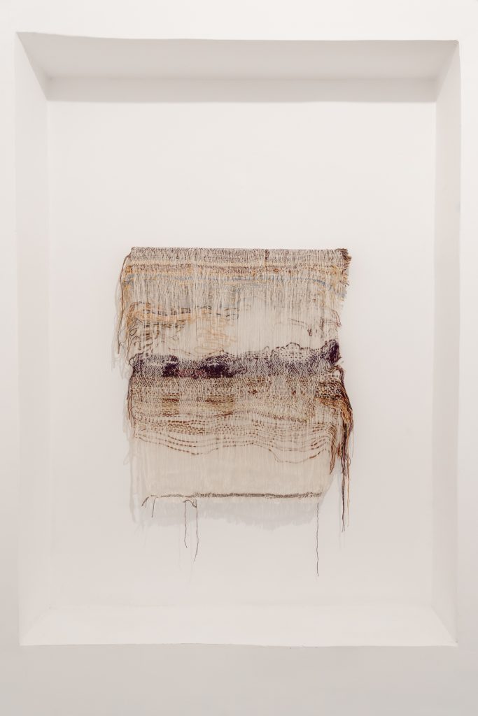 Negli ultimi anni, l’artista si è approcciata anche al mondo della tessitura e ne vediamo un esempio nella nicchia vicino all’uscita: un arazzo prodotto dall’artista grazie a un telaio jacquard digitale presso Lottozero, laboratorio creativo di sperimentazione tessile per l’arte e il design con sede e a Prato. Casadei ha preso un dettaglio di un suo dipinto e l’ha trasposto con impulsi digitali sul telaio, dando anche input di errore rispetto all’immagine iniziale e apportando delle modifiche successive. L’ordito, normalmente fitto, qui si presenta più morbido e senza regole, ricordando anche le tele dei primi anni della sua esperienza artistica, ricche di spazi bianchi. Ha cercato di esprimere il suo gesto pittorico su un altro supporto, sempre molto materico.