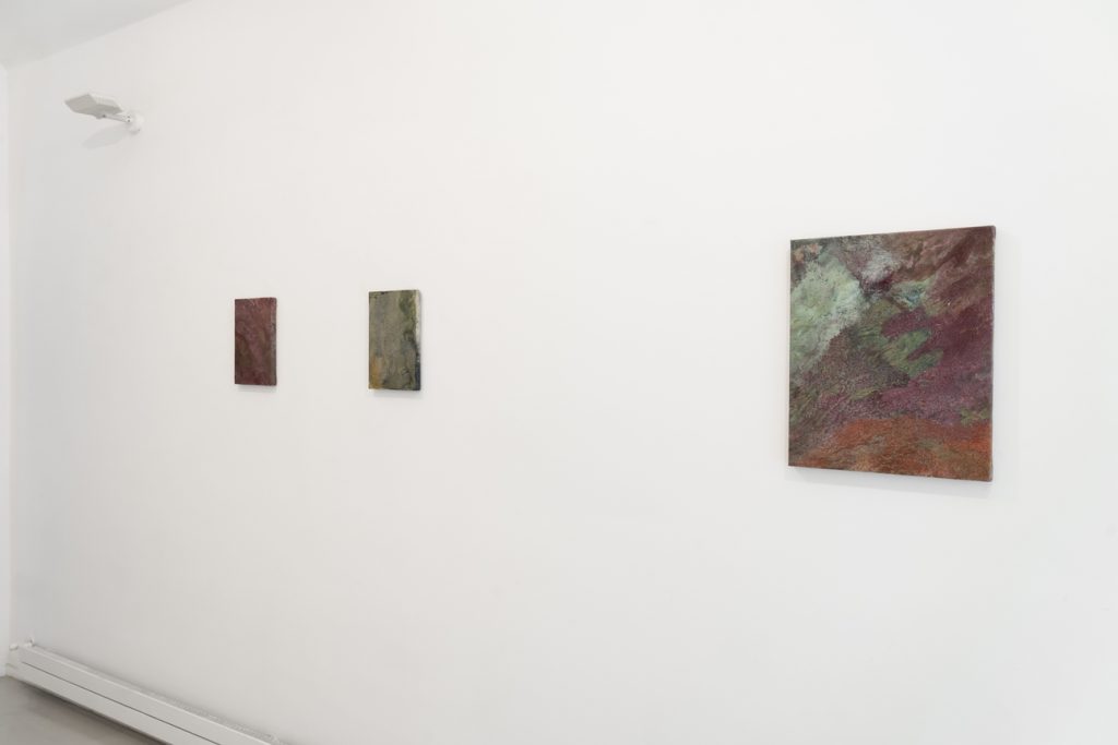 Siamo introdotti a questa riflessione gradualmente, venendo accolti all’ingresso da alcuni dipinti che rimandano al mondo naturale più terreno, alla sua mineralità, a scenari boschivi. Questi, seppur meno legati alla sfera del movimento, presentano già un elemento trasversale all’opera dell’arista: l’incontro e la commistione tra i diversi materiali d’elezione, che reagendo tra loro, a volte anche in modo indisciplinato, generano stratificazioni dalle texture più variegate, porose e irregolari. In questo caso, il risultato produce un richiamo immediato a sottoboschi fungini.