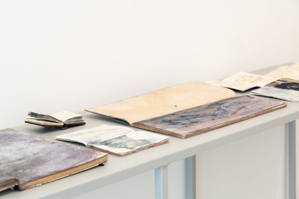 A chiudere la mostra troviamo un piccolo tavolo su cui sono adagiati diversi supporti cartacei di recupero: taccuini, registri contabili e scolastici acquistati dall’artista a Porta Portese. Casadei qui ha effettuato un lavoro molto intimista, sfruttando i diversi formati di carta per dipingervi annotazioni visive, impressioni, pensieri ed emozioni. La resa è simile a ciò che possiamo trovare in un diario, narrazione più personale e intima rispetto al resto delle opere esposte.
