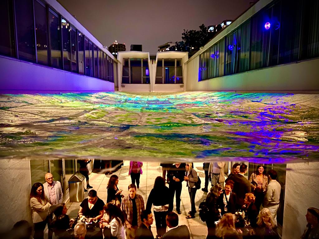 Con la mia installazione all’Istituto Italiano di Cultura a Los Angeles ho teso sulla testa dei visitatori una superficie che ricrea il pelo dell’acqua, dove sottovuoto ho messo del detersivo colorato con pigmenti fluo. Volevo mostrare come sarebbe il mare se solo si potesse vedere quello che effettivamente c’è dentro di nocivo immesso dall’uomo. Ho deciso di parcellizzare questa superficie usando una miriade di sacchi di plastica trasparente uno accanto all’altro come unità separate per sottolineare come l’egoismo, l’individualismo delle persone, degli Stati, delle aziende siano la causa del disastro ambientale. Questa sgargiante installazione, al buio però rivela una inquietante scritta “HELP” dipinta con vernice fosforescente».
