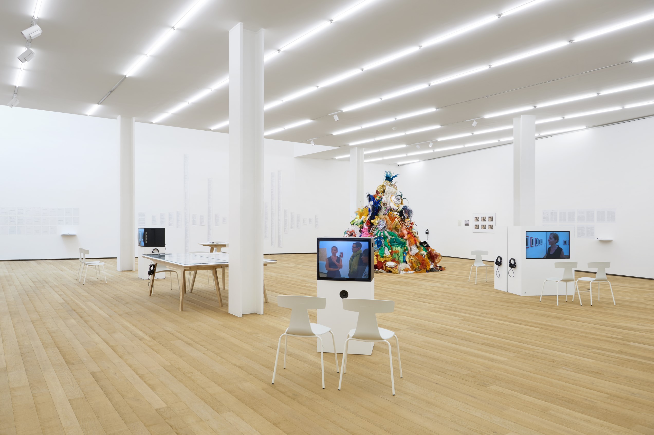 I just don’t like eggs!, fino al 22 febbraio 2025, presenta progetti che attraversano l’intera ricerca di Andrea Fraser, dalla fine degli anni Ottanta alle produzioni più recenti e richiede un’immersione, con tempo e pazienza, nell’archivio di pensiero dell’artista e della sua pratica, che si esprime in ricerche, azioni performative e incursioni nei musei e collezioni, con ruoli diversi. E così nel video Museum Highlights: A Gallery Talk del1989 vediamo Fraser vestire i panni di una guida del Philadelphia Museum of art di nome Jane Castleton, che invece di spiegare ai visitatori le opere, illustra gerarchie e i sistemi sociali all’interno del museo. Ricerche tra archivi, inventari e documenti, interviste, lunghi studi sono gli strumenti che Fraser utilizza per mettere sistematicamente in luce dinamiche, ipocrisie (il)logiche, perbenismi legate al collezionare arte.