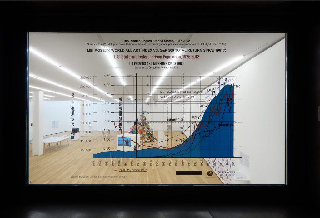 In opere successive, le ricerche di Fraser analizzano le interconnessioni tra politica e musei negli Stati Uniti – come nella corposa opera-pubblicazione 2016 in Museums, Money, and Politics – e tra mercato dell’arte e concentrazione della ricchezza in Index (Stack). Il lavoro si è poi allargato allo studio del rapporto tra costruzione di musei, costruzioni di prigioni e tassi di incarceramento, dimostrando come tra il 1970 e il 2010 il numero di carceri e musei sia triplicato, con un tasso di incarcerazione esploso al 700%. Una relazione inquietante, per un’arte elitaria, che non emancipa e non “salva” mai. Un cortocircuito, quello tra il privilegio e la sua negazione, che trova una sintesi più immediata nell’installazione sonora CCI Tehachapi at Kings Road: i suoni registrati all’interno del carcere di massima sicurezza a Tehachapi, nel sud della California, risuonano negli spazi limpidi del cortile della Fondazione Antonio Dalle Nogare, facendo sentire noi pubblico “con le nostre orecchie” un po’ come i personaggi futili e privilegiati di un film di Ruben Östlund.