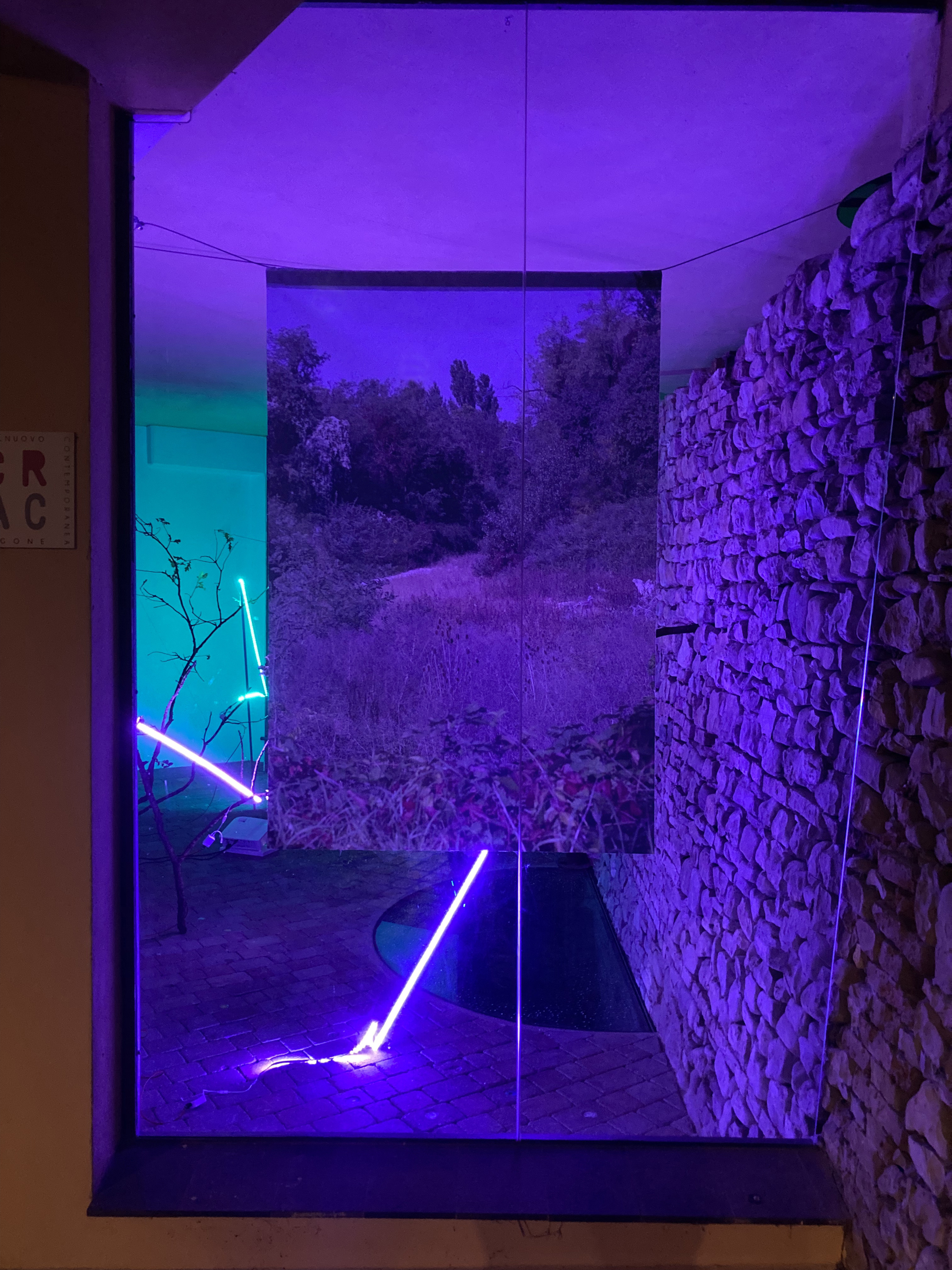 Per quanto riguarda il rapporto con il CRAC Spazio Arte, ho ideato l’intero progetto – curato da Maria Chiara Wang – in funzione della modalità di fruizione specifica di questo spazio, che avviene esclusivamente dall’esterno attraverso le due vetrine. Ho pensato immediatamente alle due stampe fotografiche – una in formato ritratto e l’altra in quello tipico del paesaggio – e poi alla dimensione testuale, realizzata anche per aiutare la fruizione dell’opera da parte del pubblico passante, potenzialmente poco avvezzo ai linguaggi dell’arte contemporanea. L’idea stessa di lavorare ad un’installazione luminosa è stata una risposta alle condizioni spaziali, ovvero alle numerose ore di buio che caratterizzano il periodo invernale nel quale la mostra sarà visitabile».