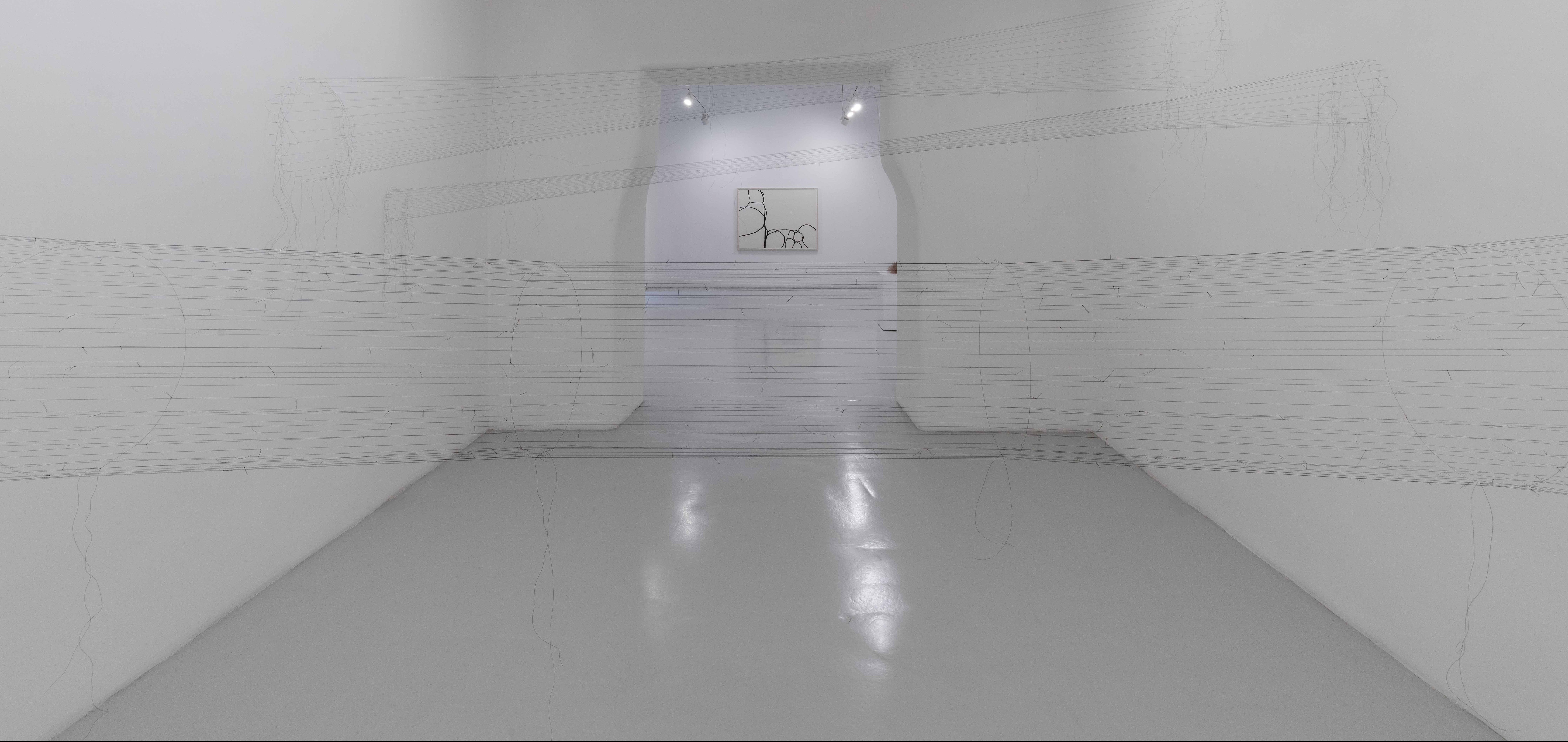 È la stessa innata energia che si riverbera nelle tele e nei disegni a inchiostro, in cui il procedere della traccia segue la medesima direzione della crescita naturale, dal basso verso l’alto, verso i lati. Soprattutto, e con maggiore felicità, nelle evanescenti strutture tubolari di crine che deformano lo spazio abitabile dell’ambiente quasi senza che ci si accorga della loro presenza. Fili sottilissimi che possono perdersi in un soffio o, se tesi, sbarrarci la strada: ancora una volta, una poetica che rimanda alla resistenza delle piccole cose.
