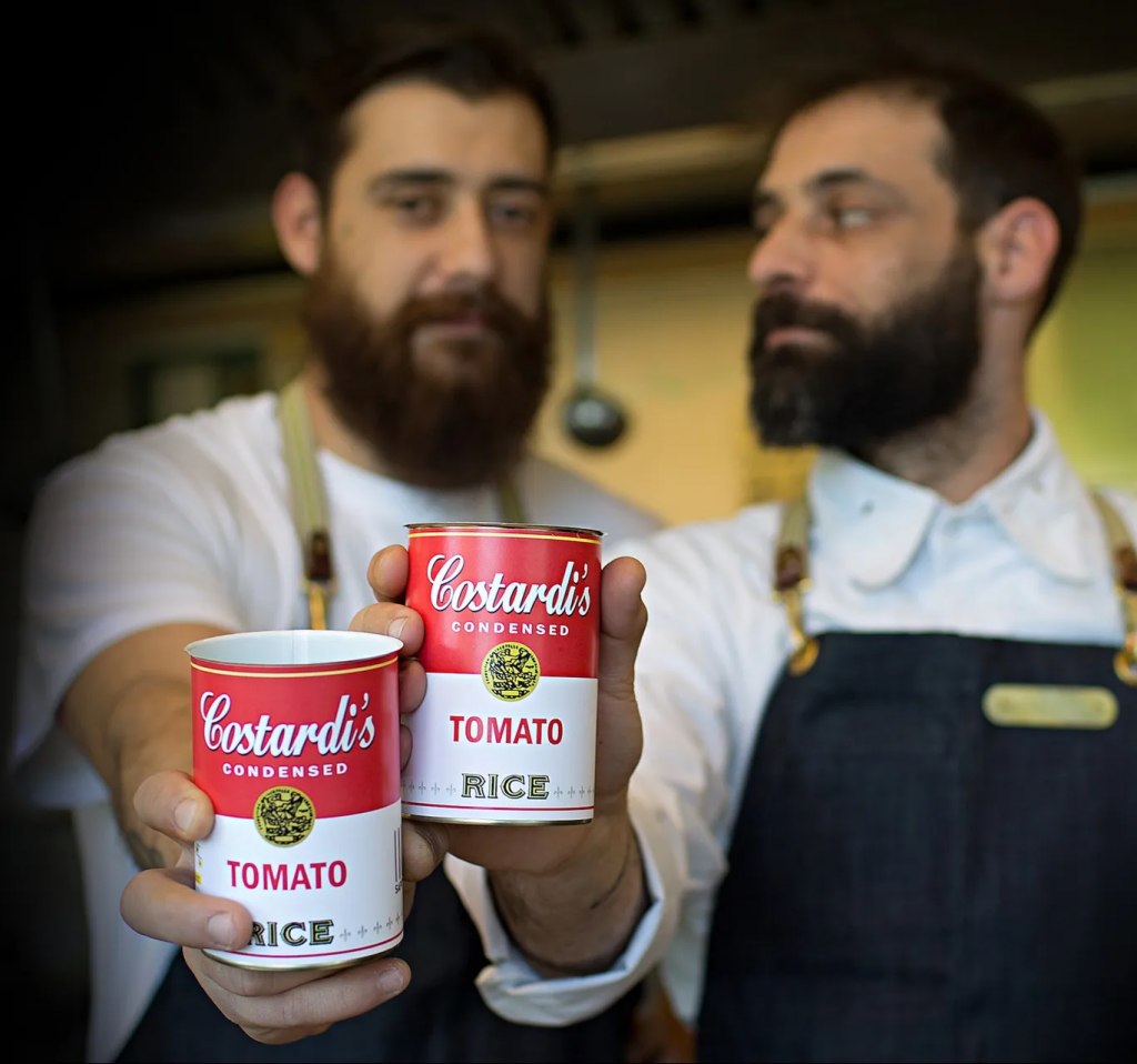Siamo a Vercelli e i fratelli Costardi hanno riletto un’idea avuta del celebre gastronomo e fotografo torinese Bob Noto: mettere in lattina non solo l’estetica pop ma i piatti della tradizione. Firma dei fratelli sono infatti le Costardi’s Condensed, che contengono varie tipologie di risotto. «La prima nasce nel 2012 ed era un risotto al pomodoro. L’idea ci viene perché a Torino c’era l’esposizione del Guggenheim dedicata a Andy Warhol, e ci chiesero di curare la parte gastronomica. Volevamo qualcosa di diverso». 18 anni di attività con un menù tutto a base di riso, che unisce ora cibo e arte trasformando la lattina di Warhol nuovamente in elemento di consumo, stavolta d’eccezione.