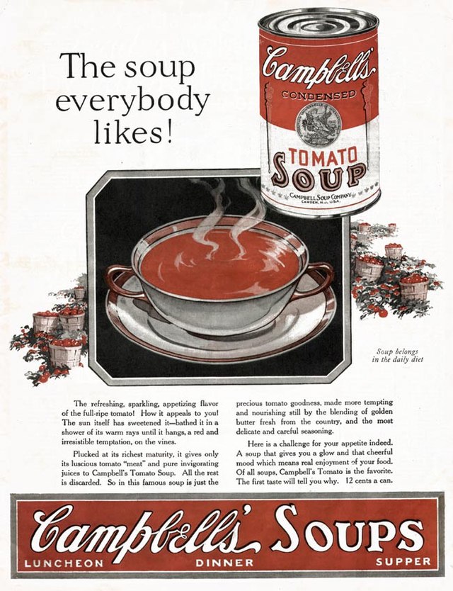 «La grandezza dell’America sta nell’essere la prima nazione in cui i più ricchi comprano le stesse cose dei più poveri». Così si legge in The Philosophy of Andy Warhol (From A to B & Back Again), pubblicato nel 1975. Warhol stava parlando della Coca-Cola, sottolineando il carattere estremamente “democratico” della bevanda. Quando, verso la fine degli anni Cinquanta, Andy Warhol sente l’esigenza di distanziarsi da Roy Lichtenstein e da James Rosenquist, avvia la ricerca di un soggetto che potesse condensare un nuovo sentire, rompere la tradizione con un elemento nuovo, aprendosi alla cultura di massa. E allora gli viene in mente proprio l’alimento che consumava ogni giorno: «Io le bevevo, avevo lo stesso pranzo ogni giorno, per vent’anni». Parlava della zuppa preconfezionata Campbell’s, ovviamente.