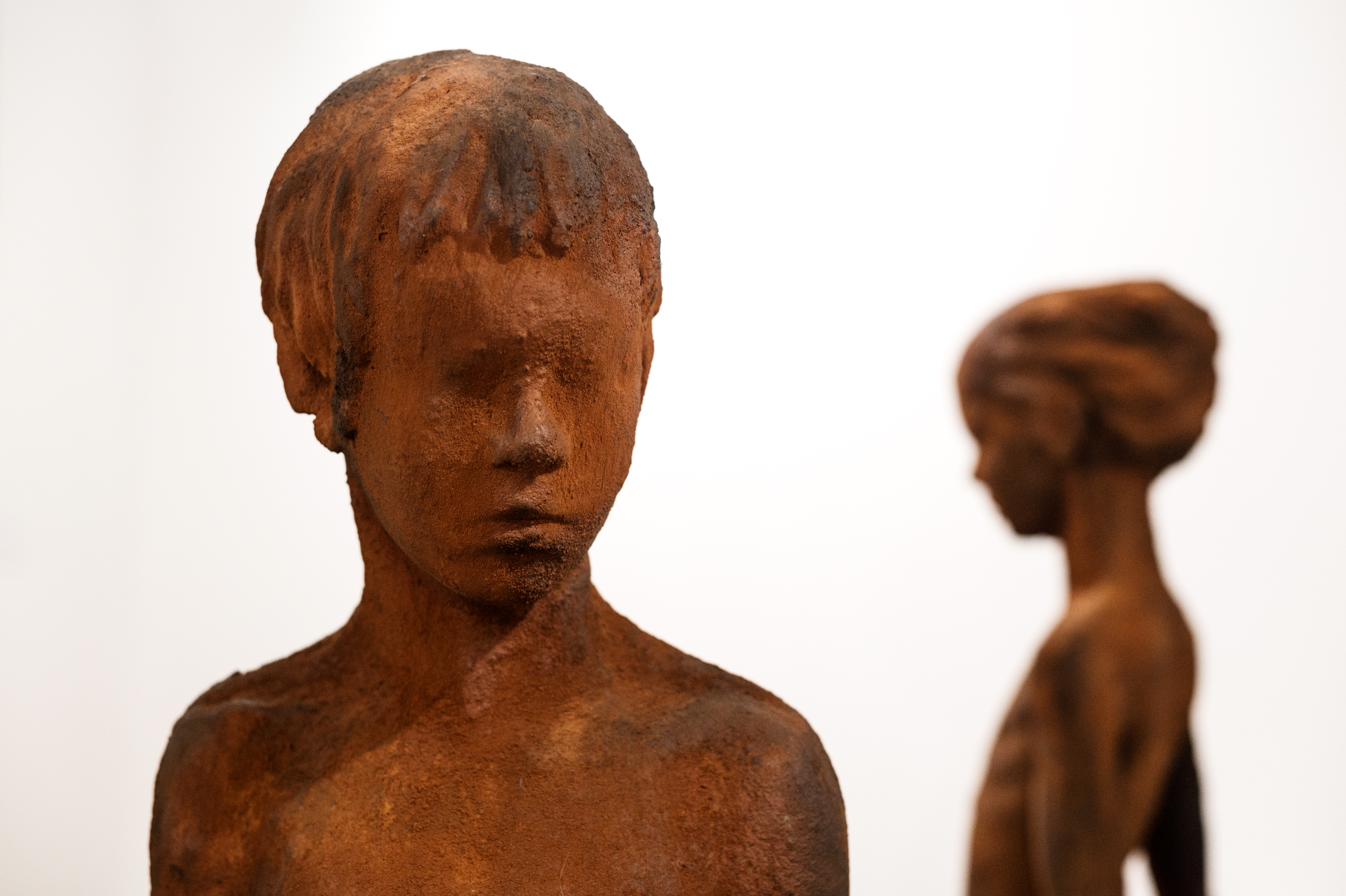 La padronanza nella resa plastica dell’anatomia dei corpi, espressa dallo scultore nel modellato, volge non verso una rappresentazione naturalistica dei soggetti, anzi li spoglia di precise caratterizzazioni fisionomiche rendendo questi giovinetti androgini di terre refrattarie, carbone e cemento come sospesi in un tempo e un luogo, o un gioco, remoti. Più prossimi alla dimensione del simbolo e del simulacro che al mondo fenomenico, gli idoli bambini di Paolo Migliazza ci sono insieme estranei e familiari, impressioni residuali di un’Aetas aurea — volendo qui espressamente citare, per più d’una affinità, l’omonima opera di Medardo Rosso — custodita al di là della cortina delle palpebre serrate, dermatica soglia rupestre ove proiettiamo di rimando le nostre sagome curiose e inquiete.