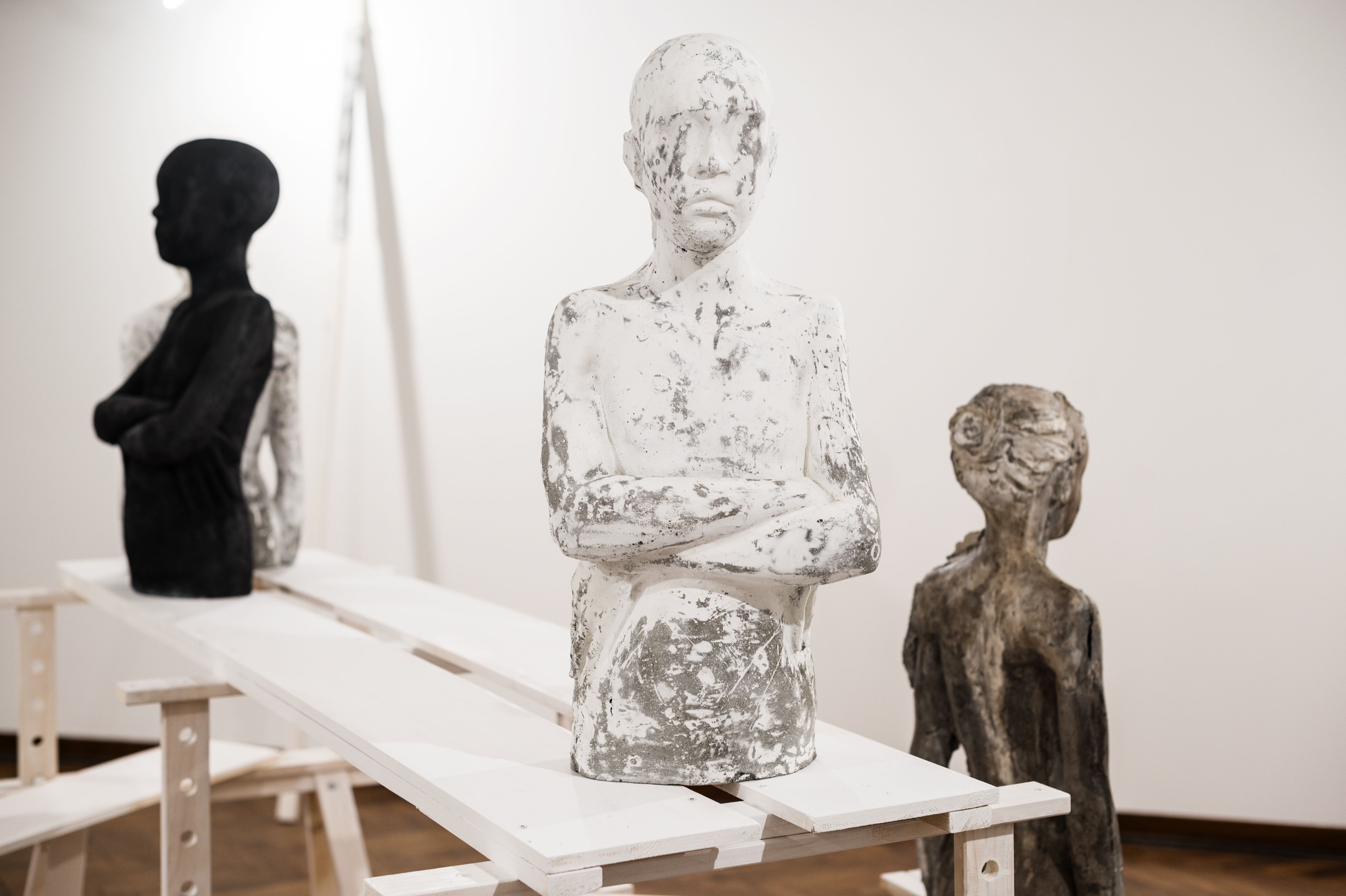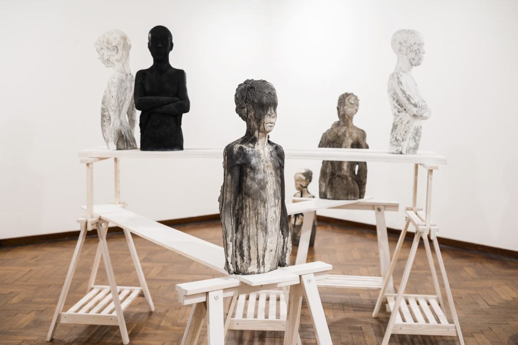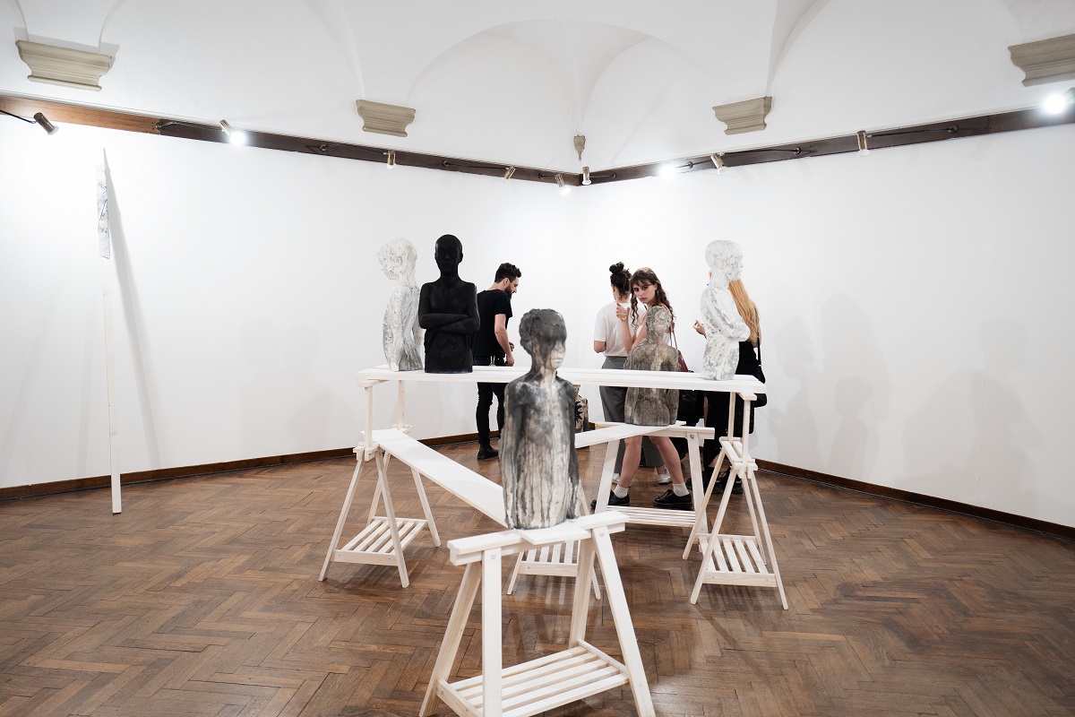 Alla galleria L’Ariete di Bologna, due gruppi scultorei, uno minore e uno maggiore, immobili oltre la fissità propria dei materiali che li compongono, raffigurano dieci busti fanciulleschi disposti su strutture di cavalletti e tavole in legno bianco. Sono le riconoscibili creazioni di Paolo Migliazza (Catanzaro, 1988) che l’artista ha in parte realizzato per questa mostra, “Raduno”, a cura di Giorgia Bergantin, e in parte per la precedente “We are not superheroes”, allestita nei medesimi spazi nel 2018.
