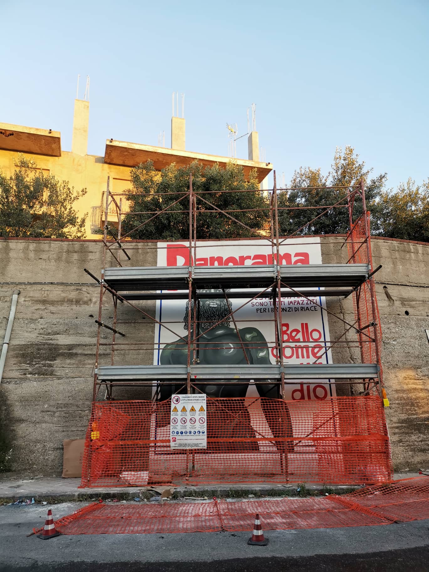 Come una scoperta in fondo al mare e una conseguente copertina della rivista Panorama possono condurre a una sorta di mania voyeuristica? Cosa ha rappresentato e rappresenta per il nostro Paese il rinvenimento nel 1972 delle statue bronzee? Questi alcuni degli interrogativi che hanno accompagnato Flavio Favelli a realizzare a Reggio Calabria Panorama, opera murale a cura dell’associazione no profit Catartica Care, in collaborazione con l’Accademia di Belle Arti di Reggio Calabria e con l’Hotel MEDINBLU e con il patrocinio morale del Comune di Reggio Calabria. Ci dicono di più Flavio Favelli e Valentina Tebala, presidente di Catartica Care.