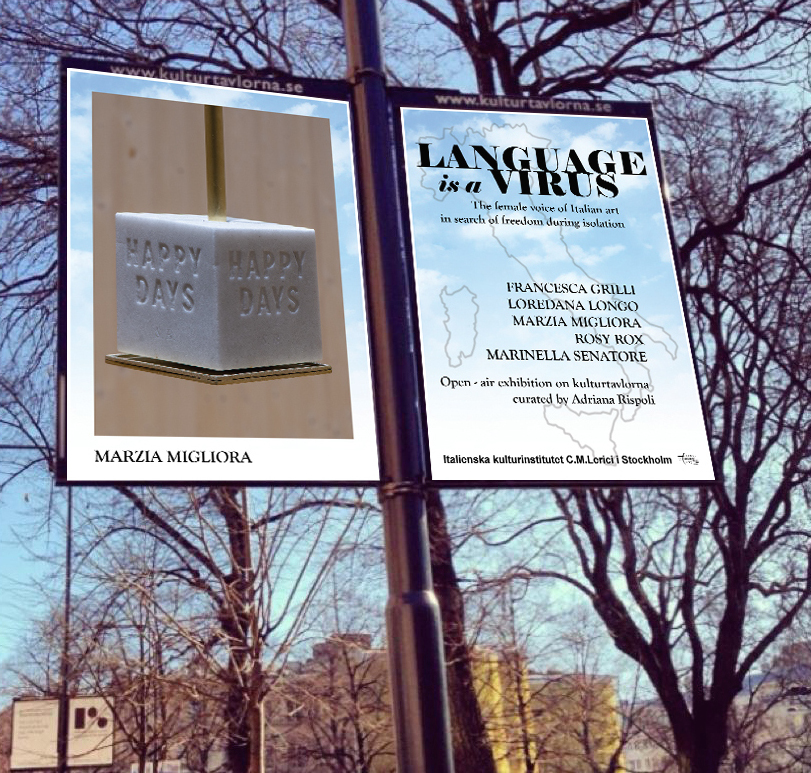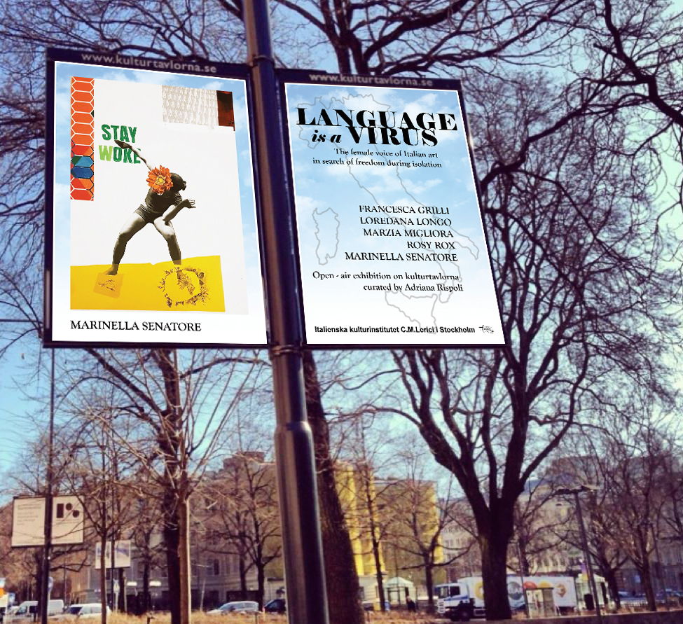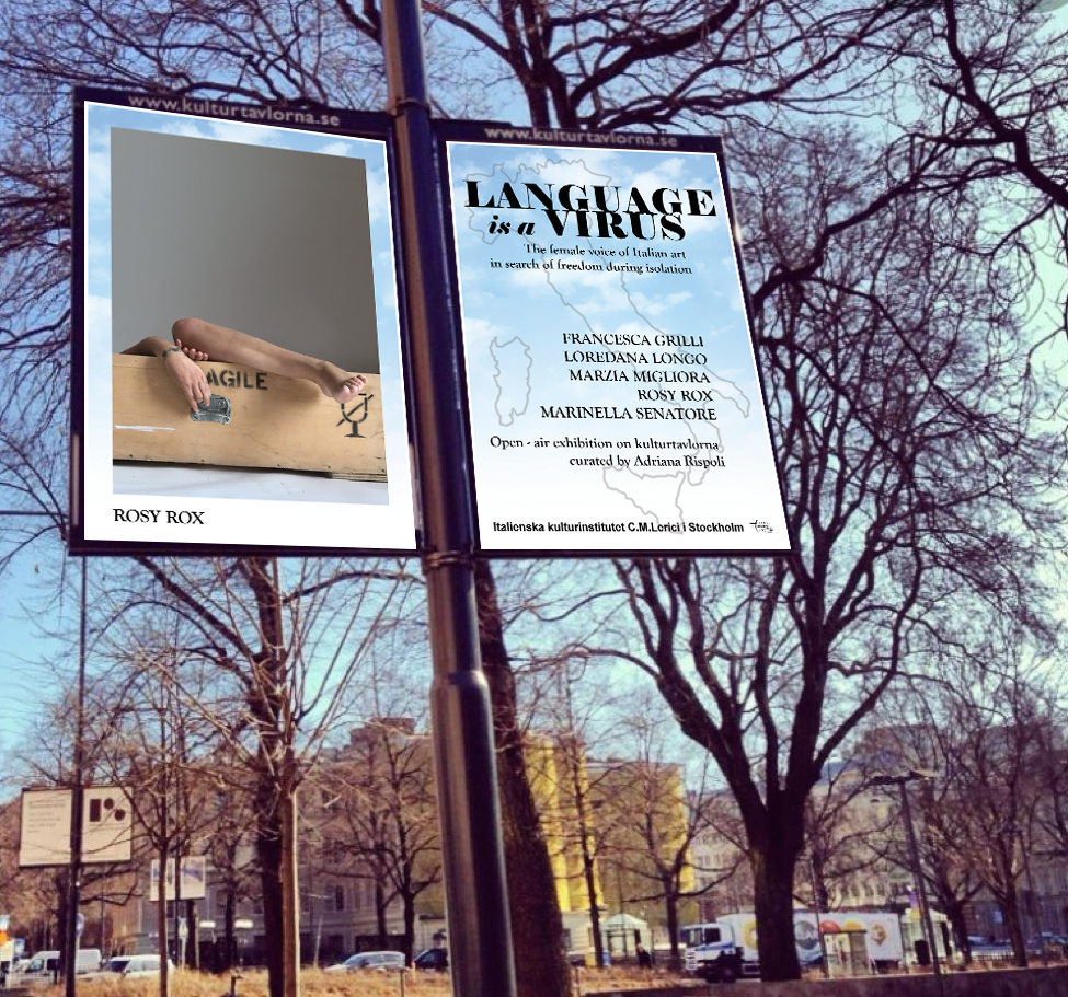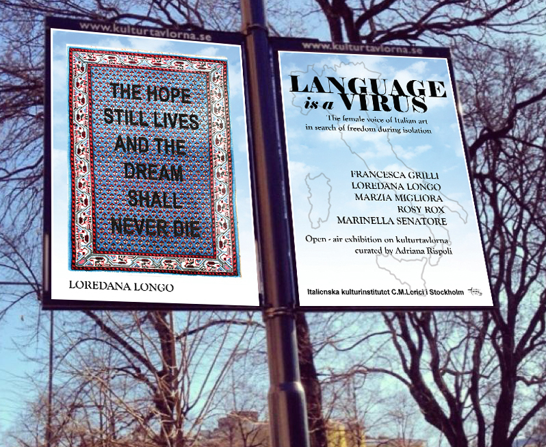 «Servendosi della tecnica dei manifesti pubblicitari, “Language is a Virus” usa come spazio espositivo le strade di Stoccolma, dove, sebbene non ci siano state restrizioni alla libera circolazione, sono stati chiusi al pubblico i luoghi della cultura quali musei, gallerie, teatri. In questa fase di forzato confinamento, il tessuto urbano si offre come spazio di comunicazione a cinque artiste italiane»: «le kulturtavlorna, ossia i cartelloni pubblicitari della capitale svedese, si trasformano dunque in veri e propri display espositivi, da cui le artiste lanciano messaggi legati alla loro personale ricerca e condizione attuale», ha spiegato l’Istituto.