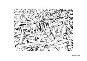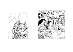 Quello di Eva ricostruisce lo stesso l’orizzonte amplio di un immaginario, quello creato dalle nostre menti dalle pagine dei nostri giornali, dalle notizie che costituiscono il tessuto connettivo della storia e della memoria collettiva del presente, della nostra attenzione verso l’altro e verso le novità tecnologiche, due campi prediletti dall’artista. L’archivio di Eva è costituito da immagini di stampe di cui vengono restituite la grana porosa e sgranata, la sfocatura nella ricostruzione fotografica. Questo è il primo prelievo che compie l’artista dal flusso dell’immaginario mediale contemporaneo. Il secondo intervento è dato da un processo di astrazione e sintesi dell’immagine che diventa improvvisamente disegno dove l’artista sottolinea certi particolari come i tessuti ad esempio, per lasciare evanescente, invece in altre parti, il tratto pulito e netto del contorno.