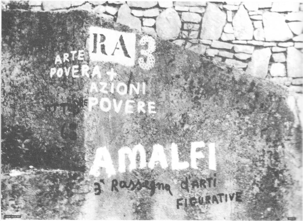 Erano i primi giorni dell’ottobre 1968 e negli Antichi Arsenali della Repubblica di Amalfi si vide in opera ciò che Germano Celant aveva teorizzato in un articolo dal piglio militante: Arte povera. Appunti per una guerriglia. “Arte povera più azioni povere”, ovvero l’invito a sconfinare, entrare nel reale, usarne gli strumenti del pensiero e i materiali. Oltre alle opere esposte negli spazi dell’Arsenale, realizzate, tra gli altri, da Giovanni Anselmo, Alighiero Boetti, Luciano Fabro, Jannis Kounellis, Mario Merz, Marisa Merz, Giulio Paolini, Pino Pascali, Michelangelo Pistoletto, Emilio Prini e Gilberto Zorio, anche una serie di interventi diffusi per Amalfi, di artisti come Richard Long, Ger Van Elk, Jean Dibbets e Paolo Icaro.