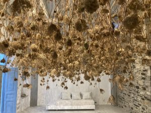 Skandali lavora abitualmente con alghe, reti da pesca biologiche, e con una grande varietà di piante selvatiche realizzando installazioni di dimensioni imponenti. Questa volta l’artista trae ispirazione esclusivamente da due tipi di piante selvatiche che caratterizzano l’intera isola: la helichrysum orientale e la carota selvatica. Le due specie si trovano anche in altre parti remote del nostro pianeta stabilendo inevitabilmente un dialogo continuo tra diverse parti del mondo, le tradizioni dell’isola, gli usi della popolazione e il territorio.