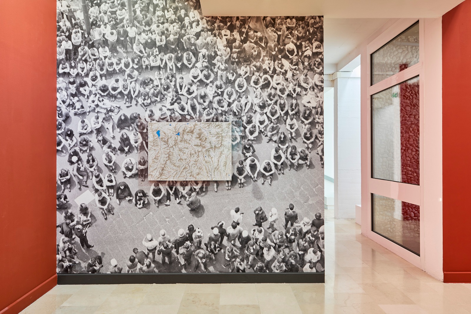 Nella prima sala si viene accolti dallo “scatto” del grande fotografo italiano Uliano Lucas, raffigurante un affollato sit-in in Piazzale Loreto nel 1971. Questa immagine diventa uno sfondo storico su cui è installata l’opera Carta Atopica, realizzata da Luca Vitone nel 1992. Al pieno sociale presentato da Lucas fa da contraltare il vuoto della mappa di Vitone, in cui anche i toponimi sono cancellati.