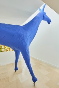 Continuando l’itinerario all’interno della mostra, troviamo le opere che guardano alla riforma psichiatrica di Franco Basaglia – promotore della legge 180 del 1978 – di Stefano Graziani e Claire Fontaine. Sorprendente è l’installazione di quest’ultima, intitolata Is Freedom Therapeutic? composta da un grande cavallo blu inserito in una stanza ristretta, che rappresenta la storia di Marco Cavallo, il simbolo della fuoriuscita daimanicomi e la distruzione metaforica delle sue pareti di contenzione.