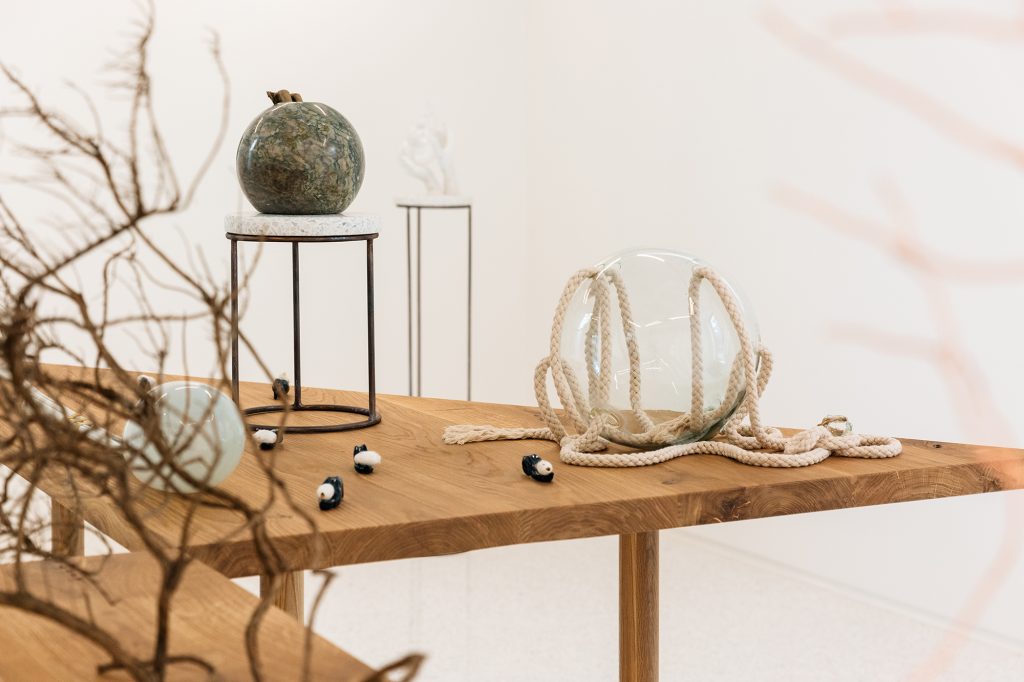 Oak, branch, glass, rope, stainless steel, glazed ceramic, plaster, natural rock formation, silkworm cocoons, copper branch, steel, terrazzo, bronze, pocahodas marble, beeswax and wick, water, hand-dyed cotton fiber
