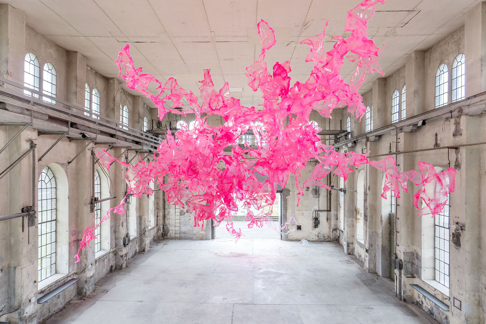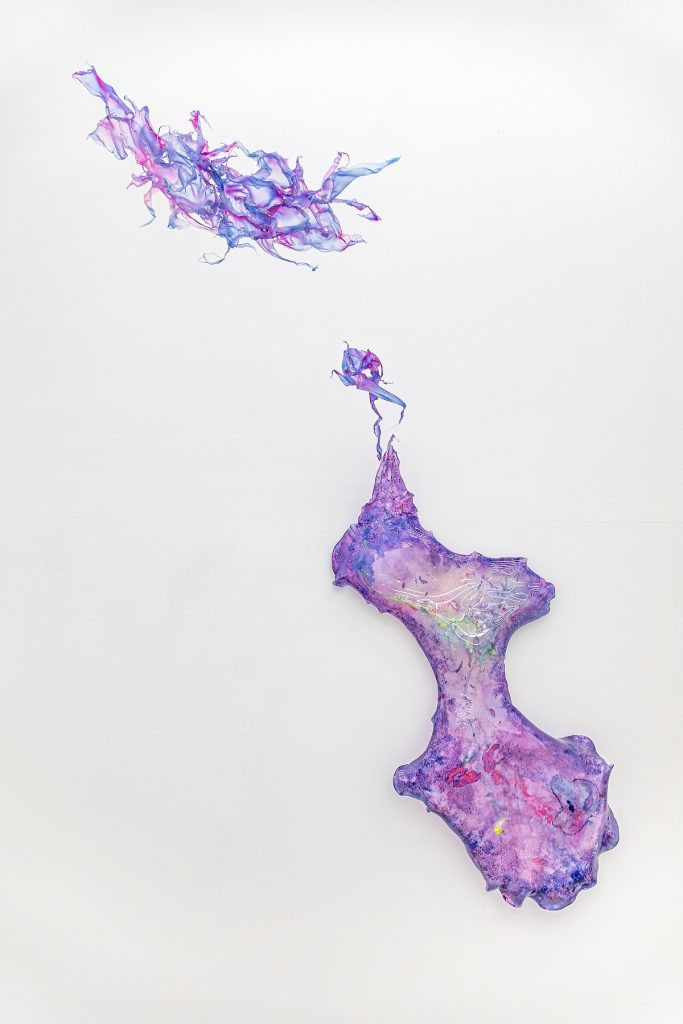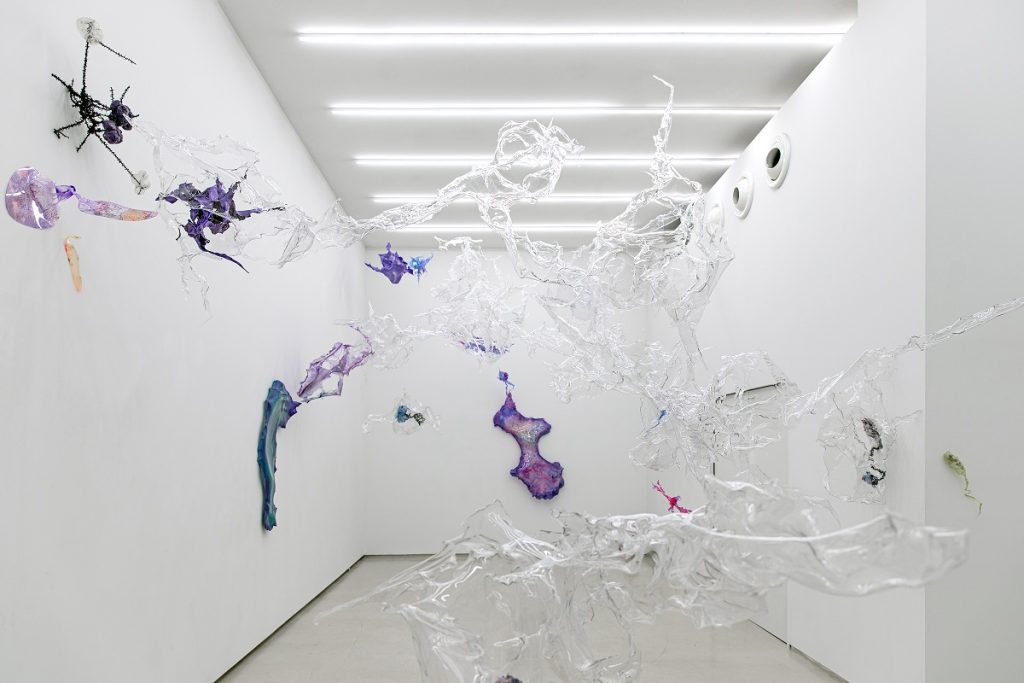 Intitolata Mutative transitions into Organic Utopia, la mostra personale di Aljoscha riassume il campo di indagine dell’artista, restituendo una serie di sculture e opere vicine all’impostazione formale pittorica. Ancora una volta, un’installazione site-specific realizzata con materiali acrilici e sintetici pende dal soffitto della galleria, trasformando l’ambiente ed invitando il pubblico a fare esperienza del proprio universo formale. La materia – colorata e allo stesso tempo semi-trasparente – vive uno stato di continua metamorfosi, complesse mutazioni che restituiscono un corpo centrale simile ad un super organismo artificiale.