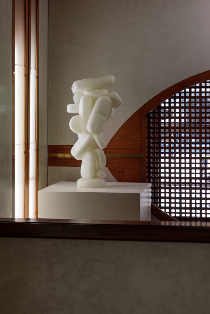 L’esposizione vanta più di ventisette sculture in vetro assieme ad una selezione di disegni, sempre di proprietà dell’artista, tra cui l’opera Arabesque, in vetro nero, realizzata a partire da un gruppo di vasi di diverse dimensioni fusi insieme e ricoperti da un cordone in vetro dall’andamento irregolare che crea una forma che si avvita su sé stessa. L’artista indaga e celebra il mistero della vita attraverso delle sculture molto intense che richiamano le forme organiche e allo stesso tempo la sinuosità dello stile moresco, presente nella tradizione decorativa veneziana.