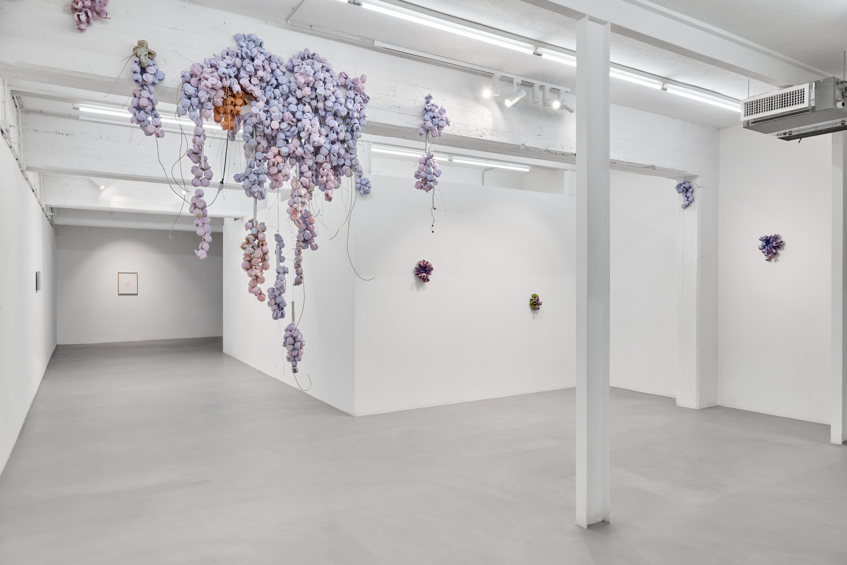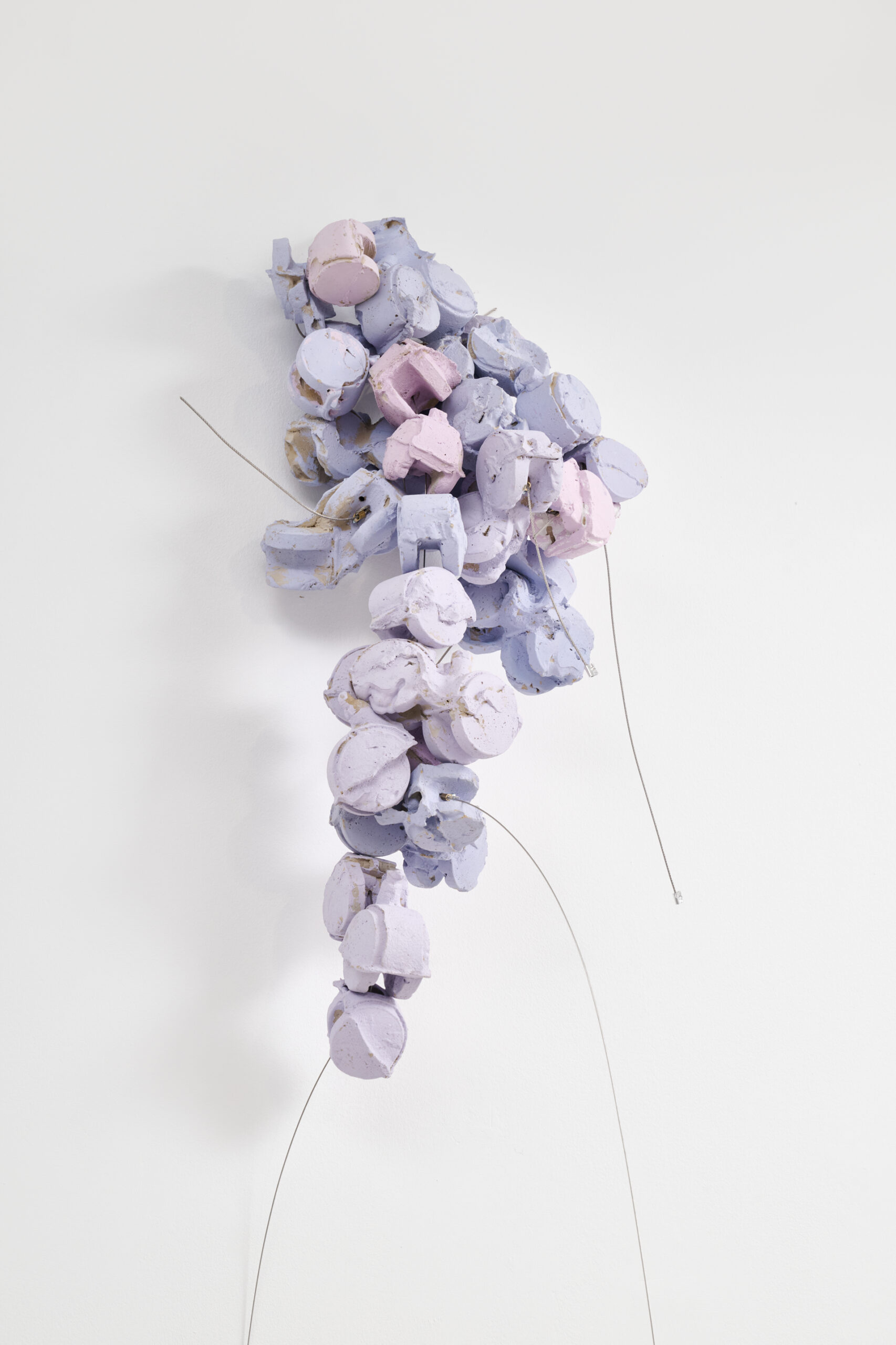 Le opere di Luca Staccioli, pensate per Falling Flowers da ArtNoble Gallery, fanno parte di un ecosistema nuovo, in cui della natura conservano solo la forma. È il caso di Sabotage of a working day, flowers (2025), un maestoso glicine pendente dal soffitto. In questo grande grappolo, primo di una serie di diverse dimensioni sparsi nello spazio espositivo, i fiori sono stati sostituiti da uno dei tanti prodotti del consumo, che spesso passano inosservati. Avvicinandosi, ecco che si distinguono numerose rotelle in ceramica e terracotta, che nella loro versione originale sorreggono le sedie da ufficio, consentendo a chi vi si siede di lavorare e produrre. In questa nuova veste, gli elementi non fungono da base ma fluttuano nello spazio, sorretti dai robusti rami in cavi e prese di corrente. Anche i colori scelti, sui toni pastello, abbandonano l’originaria estetica industriale contribuendo ad alleggerire l’installazione, che diventa improvvisamente molto delicata.