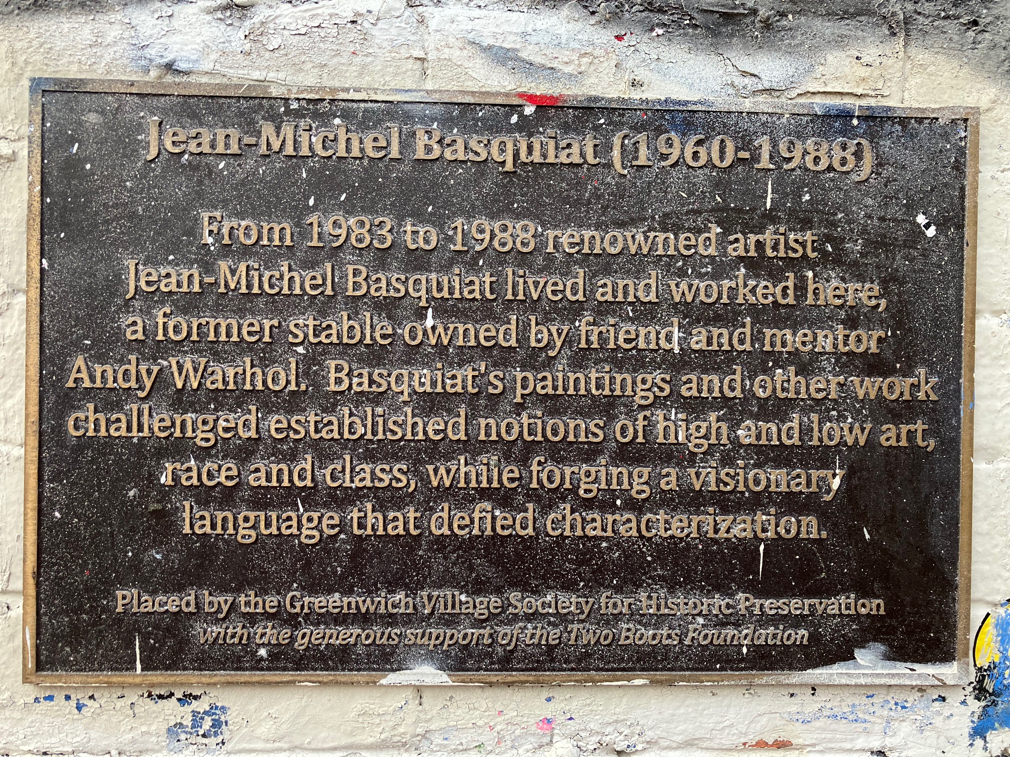 Ciliegina sulla torta: nel luglio 2016, Village Preservation, in collaborazione con Two Boots Pizza, ha affisso una targa commemorativa per celebrare il soggiorno di Basquiat, ricordato anche da diverse scritte e tag che, periodicamente, compaiono sulla facciata, nonostante i lavori di ripristino dei proprietari che, evidentemente, non gradiscono i graffiti.