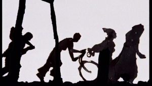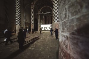 La chiesa di San Domenico, nella sua magnificenza e semplicità, nel suo intimo buio e nei suoi spiragli di luce dettati dallo scostarsi delle tende che perimetrano entrata e uscita, accoglie le opere di Kentridge. Un allestimento minimal, ma funzionale. Le opere, immagini in movimento che scandiscono lo spazio, generano ierofanie. Al culmine della navata centrale della Chiesa di San Domenico troviamo Shadow Procession (1999), un cortometraggio che si determina come manifesto contro l’oppressione umana. Kentridge, grazie alla collaborazione con Handspring Puppet Company, ha realizzato una serie di silhouettes che si muovo lungo una processione. Una parte del cortometraggio è dedicata alla figura tirannica ed inquietante di Ubu, che coincide per Kentridge con alcune personalità politiche contemporanee.
