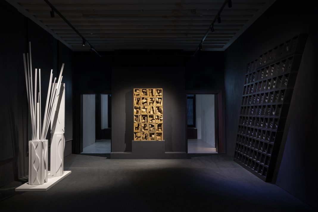 In questi imponenti spazi completamente ristrutturati dall’architetto David Chipperfield, la mostra “Persistence” a cura di Julia Bryan–Wilson ideata in collaborazione con la Fondazione Louise Nevelson presenta oltre sessanta opere che trasudano di una misteriosa energia. Questa personale della scultrice di umili origini emigrata negli Usa nel 1905, che nel 1962 fu scelta per rappresentare gli Stati Uniti alla 31° Biennale di Venezia, si concentra sulla potenzialità totemica dell’assemblage che richiamano l’idea del totem e della metamorfosi dei corpi. In questi saloni, grandi e piccole opere per lo più senza titolo, abbracciano trent’anni di lavoro e di abilità compositiva di combinare diversi materiali, passando dalle celebri monumentali sculture nere da muro, ma anche i meno conosciuti collage; il tutto esposto seguendo una traccia non cronologica. Trasudano di misteriosa enigmaticità i suoi monumentali “neri”, bianchi e oro, tra le altre si distingue Moon Spikes (1953), un’opera giovanile, dalla superficie monocroma dipinta di nero che prelude il suo riconoscibile modus operandi ,sviluppato anche nelle opere successive.