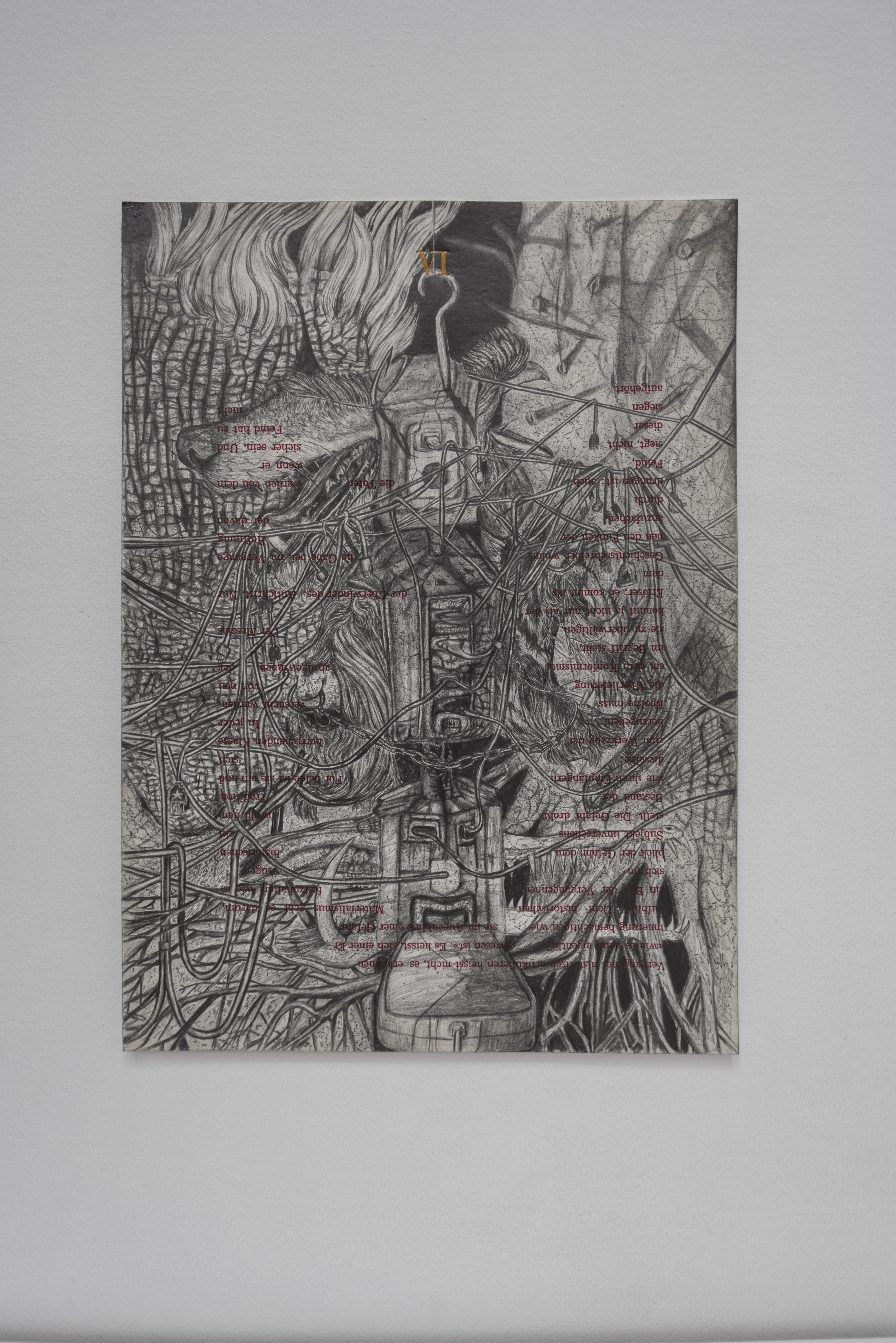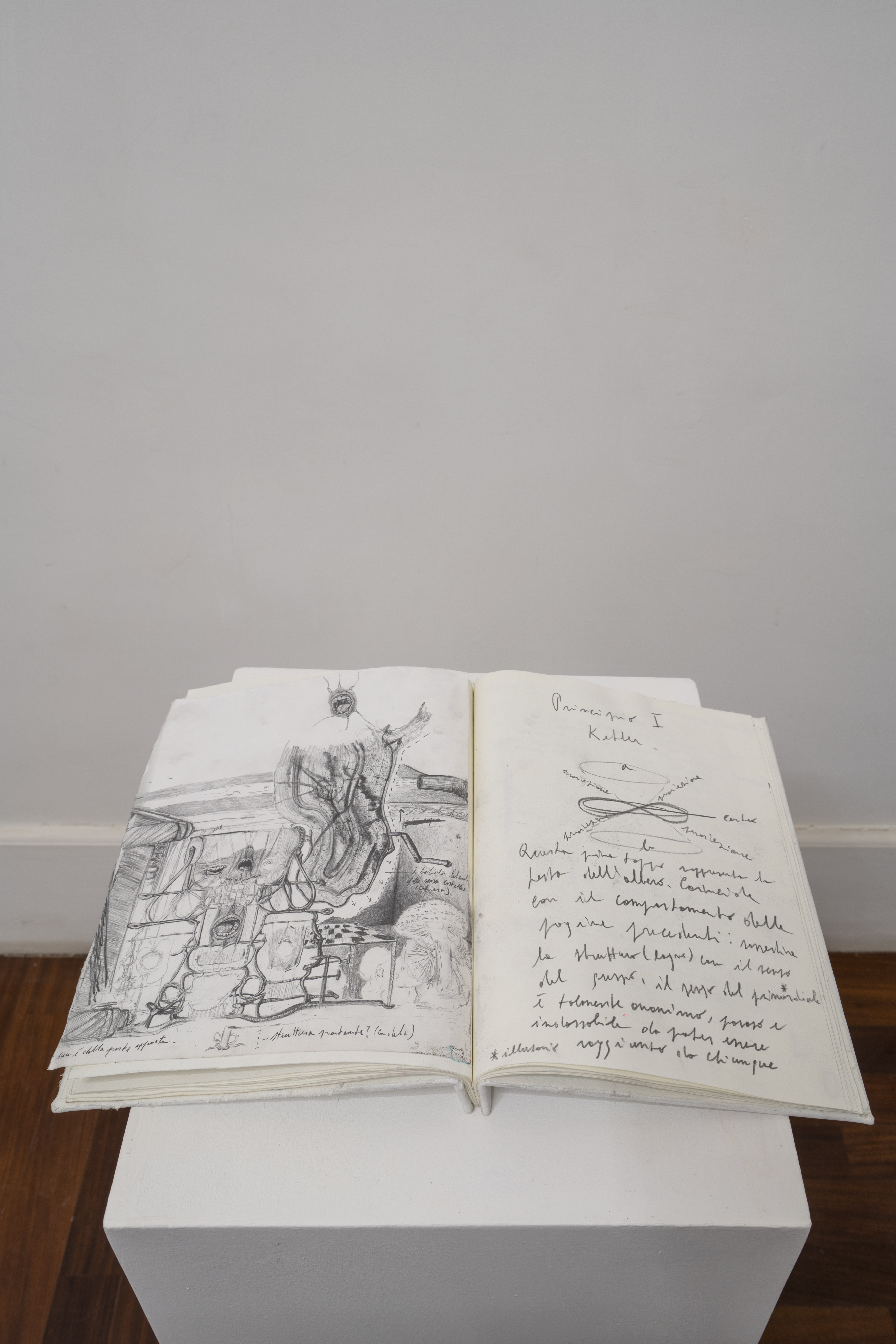 Di fronte al grande disegno, un libro d’artista riproduce un unico esemplare del 1743, dal titolo La guerra agli alberi. Nel frammento si fa riferimento a una “bislacca teoria infernale” attribuita a un misterioso autore con cui l’artista decide di entrare in contatto, cancellando, sovrascrivendo e commentando con vena parodistica i suoi contenuti alchemici.