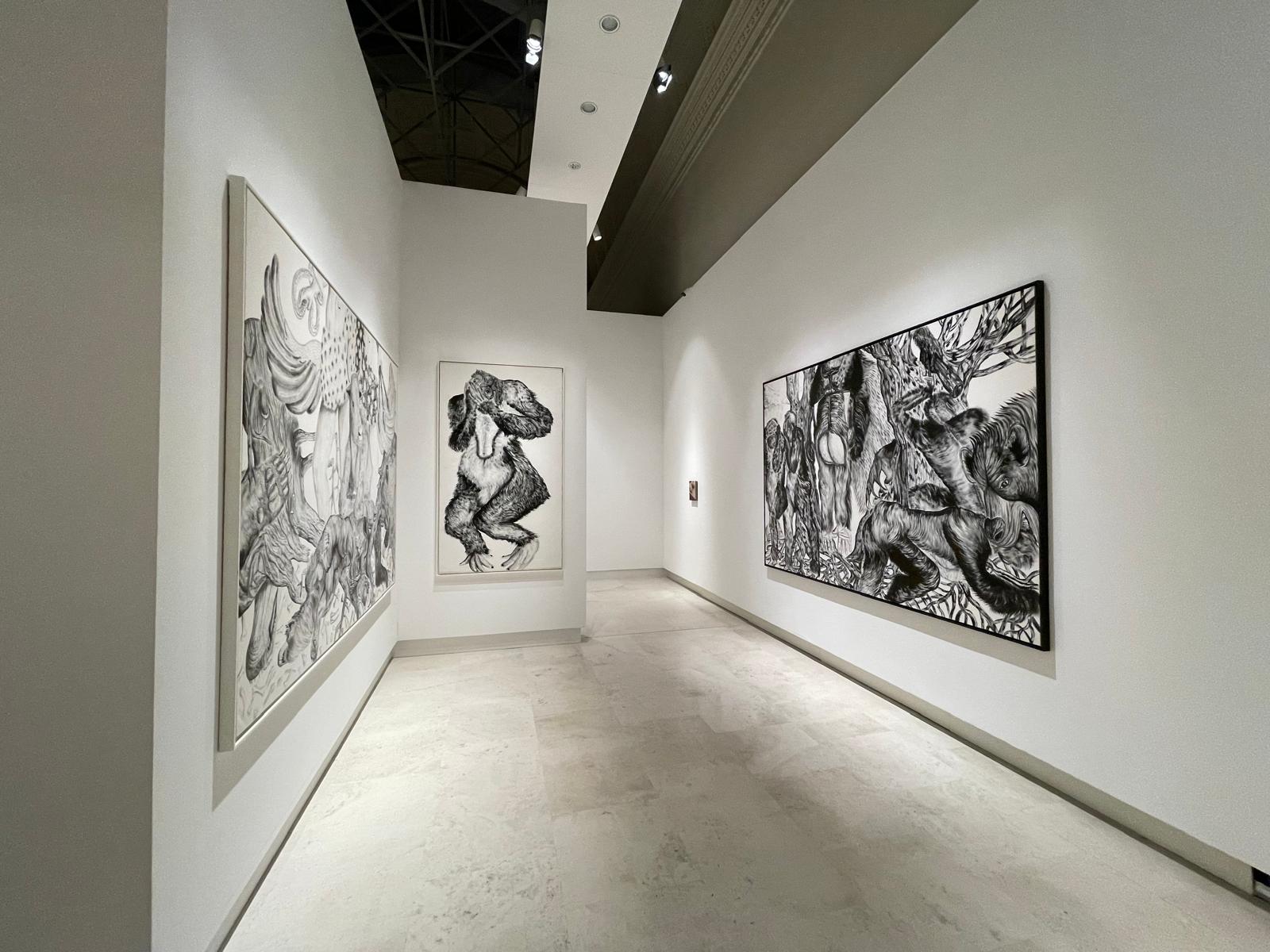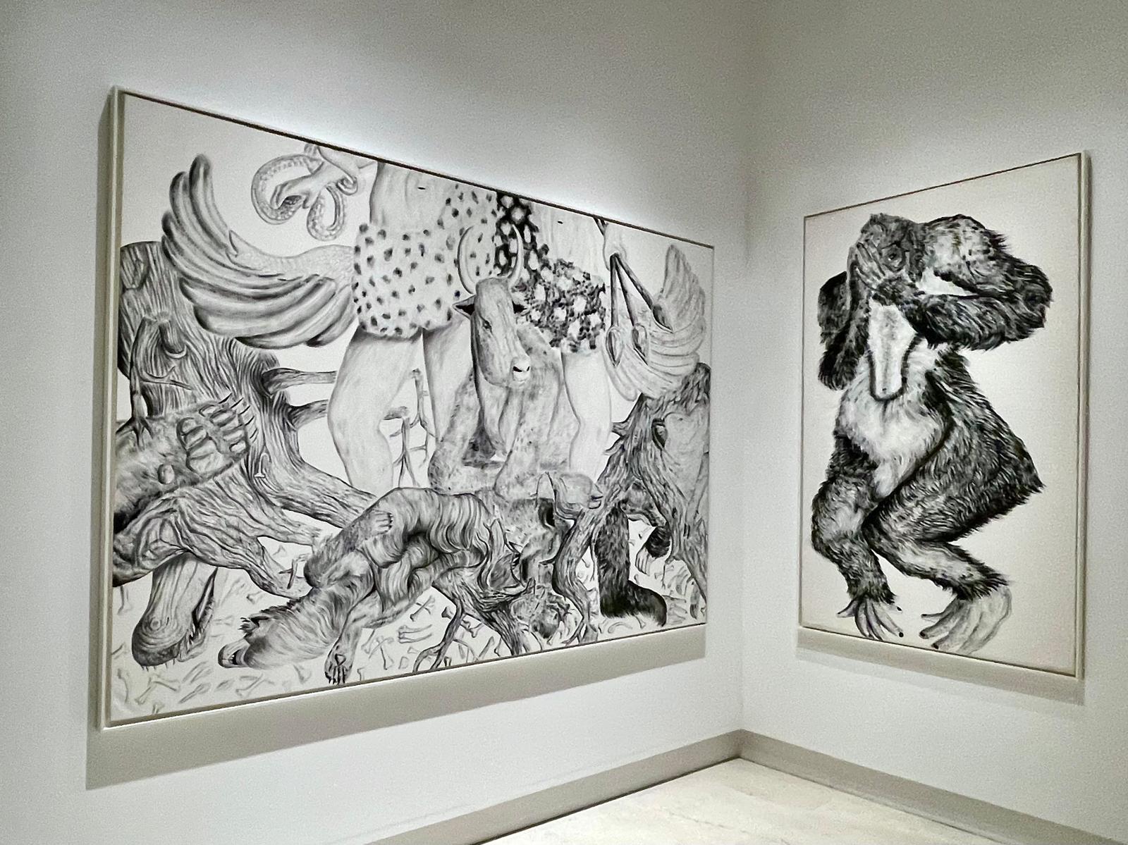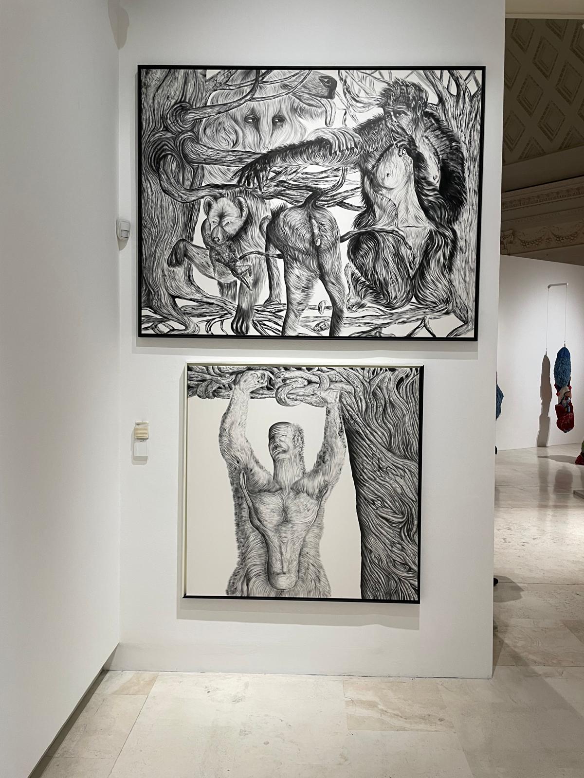 In Il dono (la notte) (2025) si assiste a una ulteriore messa in forma del patto sociale. La figura materna offre il proprio “frutto” alle iene e invita al silenzio, mentre una figura mostruosa indefinita osserva la scena con un’inaspettata compassione. L’immagine, sospesa tra sacrificio e mutismo, sembra evocare il rovesciamento del mito originario della cura: la nascita come atto di consegna alla violenza, la maternità come rituale di potere. In filigrana emerge il culto della morte come fondamento simbolico dei grandi totalitarismi.