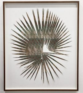 L’opera di Trevisani presenta un originale remix di motivi floreali tratti da altri artisti e designer del Novecento, risolti in una nuova texture stampata su grande foglia essiccata: sono organismi viventi artificiali esposti come si trattasse di un pattern di un museo di storia naturale.