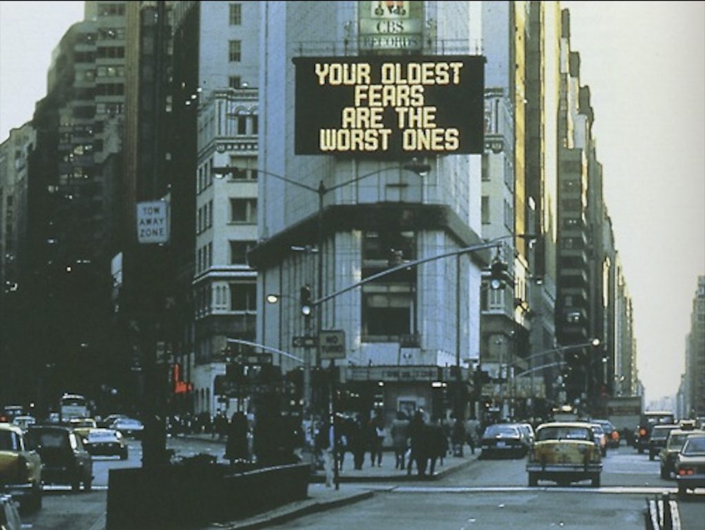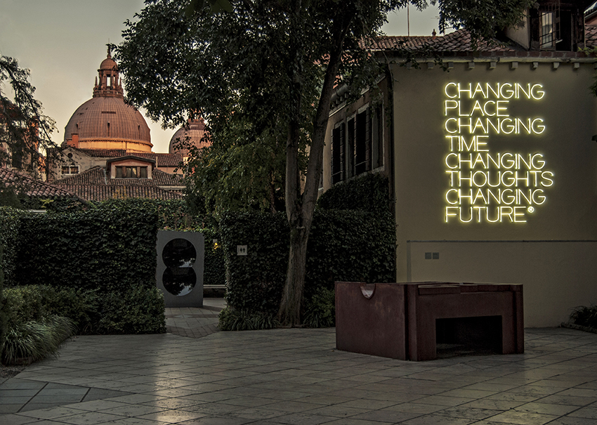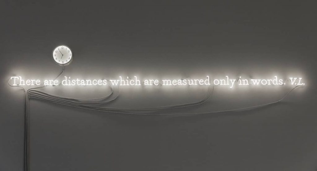 Turrell, Dan Flvain, Eliasson, la storia dell’arte contemporanea ci offre numerosi esempi di artisti che hanno utilizzato la luce per creare installazioni immersive che invitano alla contemplazione e alla connessione con l’universo (James Turrell); alla riflessione sulla propria esperienza del mondo (Olafur Eliasson); a perdersi in un mondo di infinite possibilità (Yayoy Kusama); o all’indagine filosofica (Joseph Kosuth, per esempio, e il suo Existential time #03’ – There are distances which are measured only in words. V.L.). Altri artisti invece, che pur hanno scelto la luce, hanno pensato di “incanalarla” in frasi semplici e dirette per trasmettere messaggi di pace, di comprensione, di azione, di dubbio o anche di critica. Del resto The True Artist Helps the World by Revealing Mystic Truths, no? L’iconica opera di Bruce Nauman datata 1967, sembra volerci dire proprio questo, ovvero che il vero artista aiuta il mondo rivelando verità. Anche ovvie, se si pensa al titolo di un’iconica serie a cui Jenny Holzer diede inizio negli anni ’70, Truisms, nella forma di una lunga sequenza di sentenze, lunghe una riga e ordinate alfabeticamente, per lo più presentate singolarmente o a gruppi, sui supporti più vari. Qualche esempio da portarci nel nuovo e tenere a mente? Eccoli: a little knowledge can go a long way / un po’ di conoscenza può fare molta strada; a name means a lot just by itself / un nome significa molto già di per sé; a positive attitude means all the difference in the world / un atteggiamento positivo fa tutta la differenza del mondo; a sense of timing is the mark of genius / il senso del tempo è il segno del genio; it’s crucial to have an active fantasy life / è fondamentale avere una vita di fantasia attiva; remember you always have freedom of choice / ricordate che avete sempre la libertà di scelta.