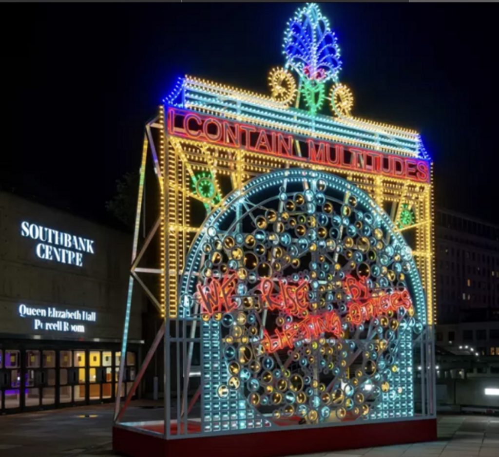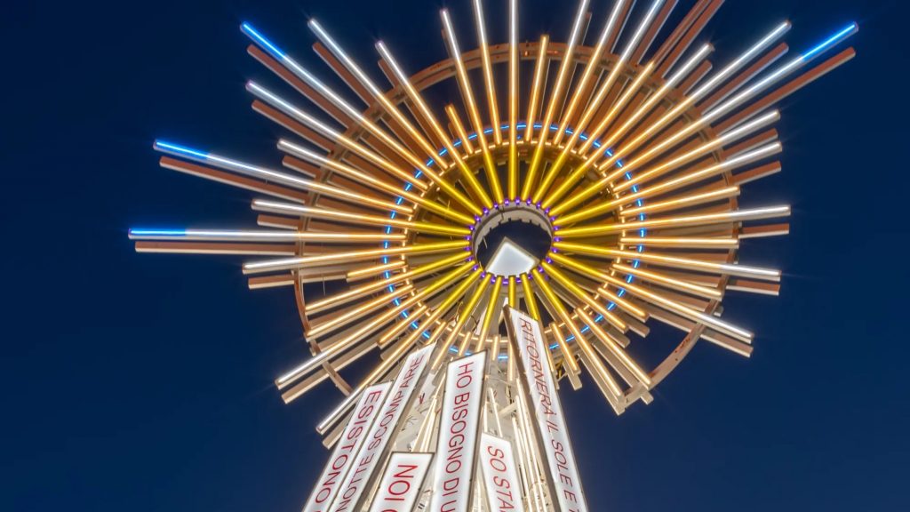 E a proposito di rinnovarsi, WE RISE BY LIFTING OTHERS di Marinella Senatore calza a pennello. Tradotto letteralmente “ci eleviamo sollevando gli altri”, questo progetto in particolare, e tutta la ricerca in generale, è inclusivo non solo nelle intenzioni ma anche concretamente nei fatti. Solo pochi giorni fa (ne abbiamo parlato qui) ad accompagnare Papa Francesco nell’apertura della seconda Porta Santa nel carcere romano di Rebibbia è stata inaugurata un’altra opera di Senatore (Io contengo Moltitudini): una torre luminosa alta sei metri, intreccio di architettura popolare e parole scritte dai detenuti delle sezioni maschili e femminili, frutto di un workshop partecipativo che ha dato voce alla comunità carceraria. «La luce, ispirata alle tradizioni del Sud Italia, ha la capacità di trasformare un luogo in uno spazio speciale», ha dichiarato l’artista che in più di un’occasione, sfumando il confine tra arte e vita, ci ha coinvolti in esperienze visive, di immaginazione e di socializzazione senza precedenti, rivolgendosi a noi, come entità vive e in continua trasformazione.
