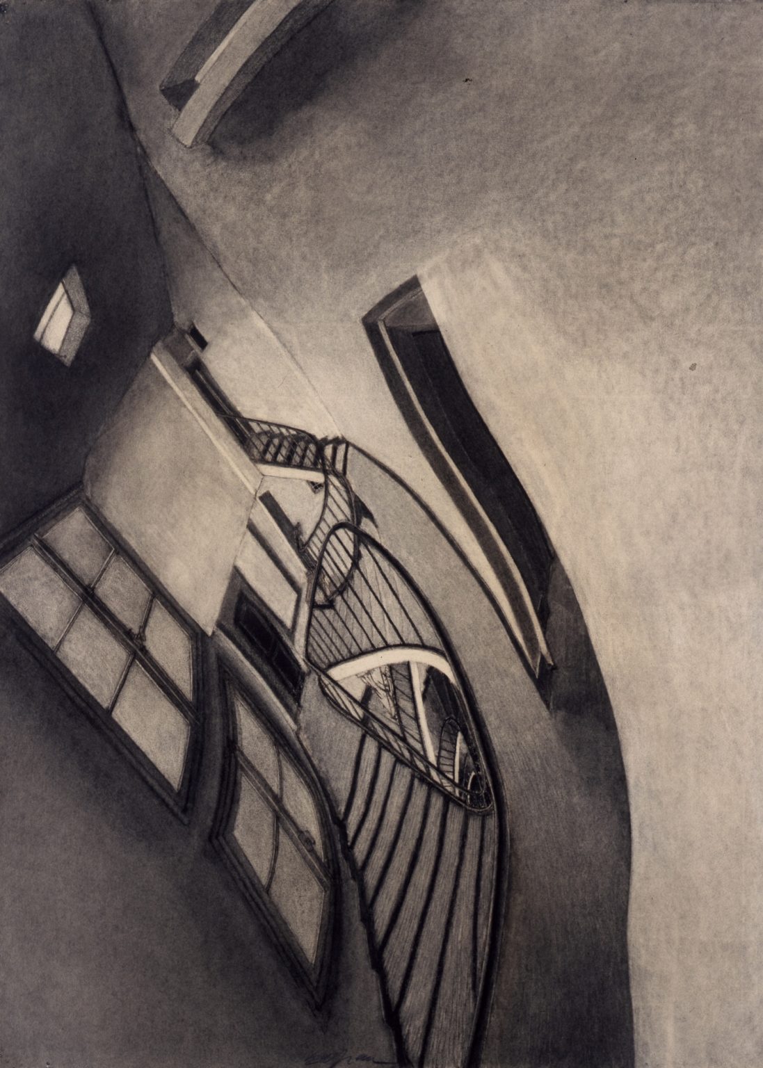 Le prime immagini sono quelle realizzate a carboncino. Poi il colore esplode e in particolare si autoesalta nella rappresentazione di centinaia di bacchette di pastelli Roché meticolosamente riprodotti in un’ironica tavolozza. E appaiono in sequenze ossessive scale curvilinee o elicoidali, a spirale, sospetti di anamorfosi che sembrano sfidare la logica funzionale in una deformazione onirica, rivisitazione dei deliri di Piranesi o delle fantasie di Esher.