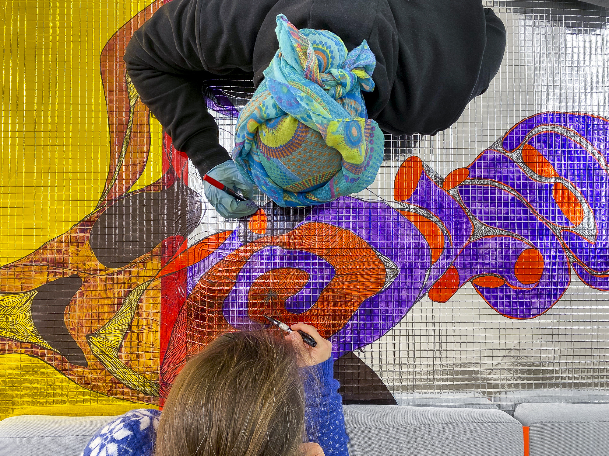 La vela, anima strutturale dell’imbarcazione, il mezzo che le permette di realizzare la sua essenza, il viaggio e la navigazione, diverrà cosi il supporto dell’opera del collettivo. I due volti, dorato e argentato, saranno lo sfondo di una decorazione sgargiante e vibrante, legata a questo ideale di resistenza che fonda le sue basi nel suo stesso materiale, connesso ad un immaginario di fragilità e difficoltà.