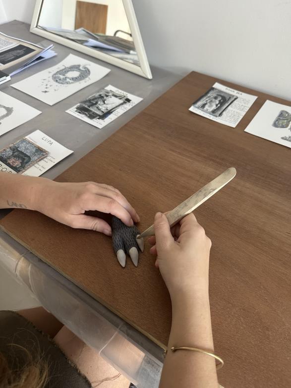 «Il progetto consiste in una serie di specchi-sculture ispirati dunque a figure femminili della mitologia romana, associate a un mito, un animale e un simbolo. Queste opere esplorano i temi del potere femminile, della trasformazione e del legame tra corpo, natura e mito. Ogni specchio in ceramica combina rilievi organici, texture animali e vegetali», scrive Isabella Vitale nel testo critico di accompagno alla mostra.