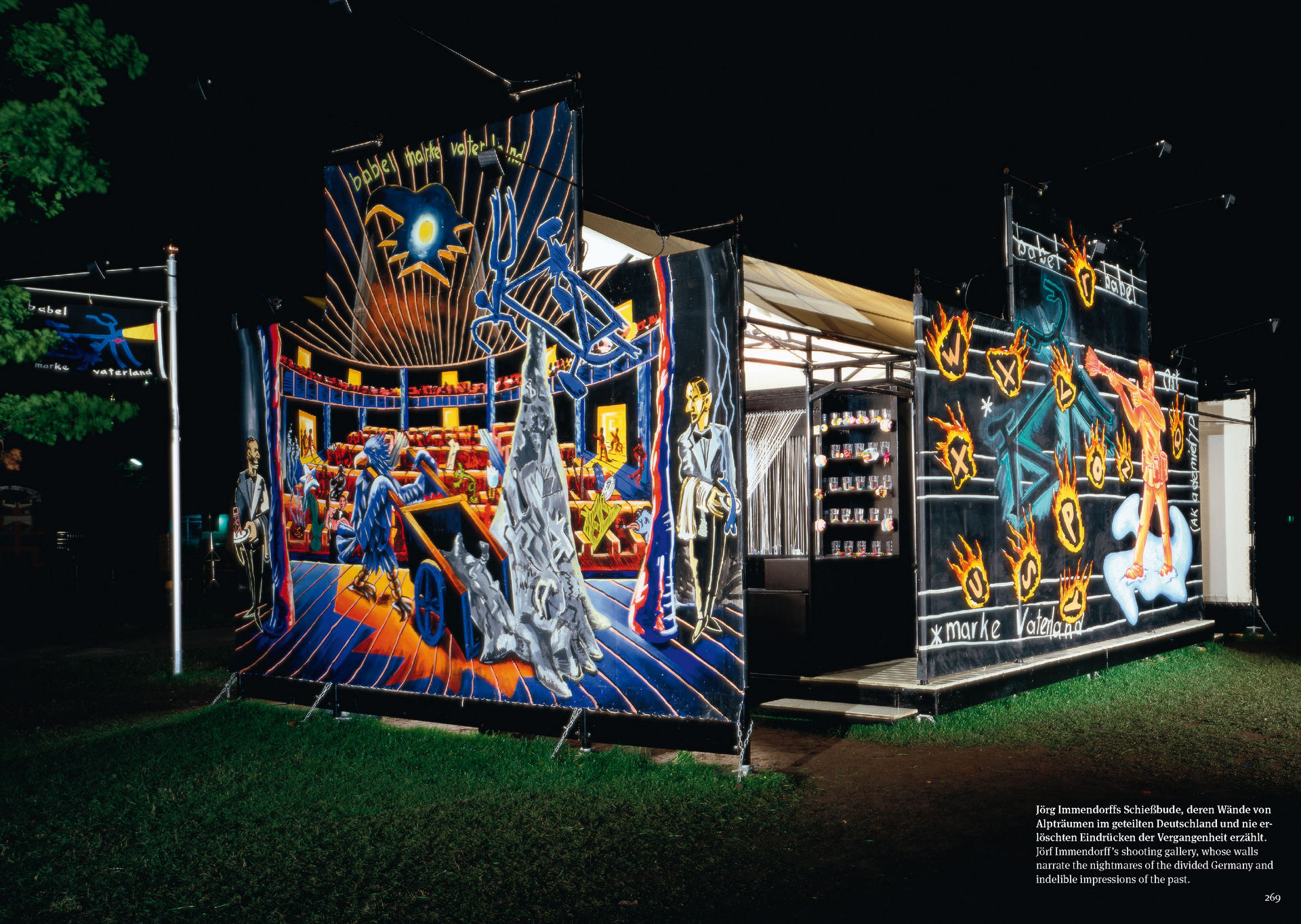 C’erano circa 30 attrazioni, tra cui una stanza delle ombre di Georg Baselitz, un albero incantato musicale di David Hockney, un labirinto di vetro dai colori vivaci di Roy Lichtenstein. Kenny Scharf creò sei sculture comiche e dipinse più di 100 quadri in un laboratorio viennese, montati attorno a una giostra oscillante. Tra le altre attrazioni, il cancello d’ingresso progettato da Sonia Delaunay e un carro da circo dipinto a mano da August Walla. Ogni attrazione aveva la sua musica individuale: Philip Glass compose la musica per il labirinto di vetro di Lichtenstein, mentre Karajan registrò addirittura una serie di tracce con la Filarmonica di Berlino per l’installazione di Hockney. Per la sua ruota panoramica, Basquiat scelse l’album “Tutu” di Miles Davis.