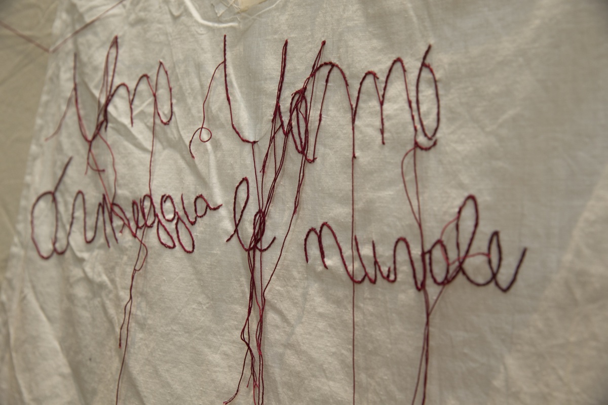 «Nel 2003, ad Alghero, la grande installazione Llencols de algua. Lunghe lenzuola bianche cucite corrono lungo una grande parete. Sulle lenzuola sono attaccate a grandi punti rossi fatti a mano vecchie camicie da notte ricamate con le frasi recuperate da Maria in un lavoro con i bambini delle elementari, “Prima che la scuola li rovini”, come usava dire».