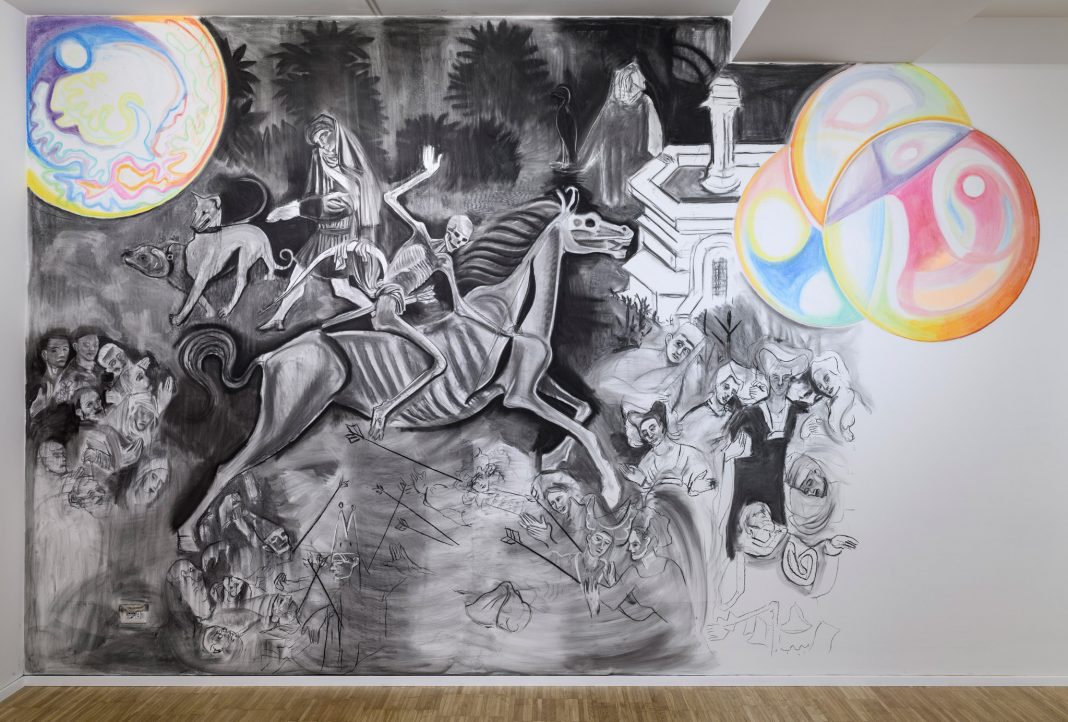 Il wall drawing più grande tuttavia torna alla grafica, abbandonando il testo scritto. Si tratta di un murales ispirato al Trionfo della Morte, l’affresco conservato nella Galleria di Palazzo Abatellis a Palermo. L’allegoria di Bauer incombe come memento, benché la gravità del soggetto sia smorzata dallo stile quasi fumettistico del tratto.