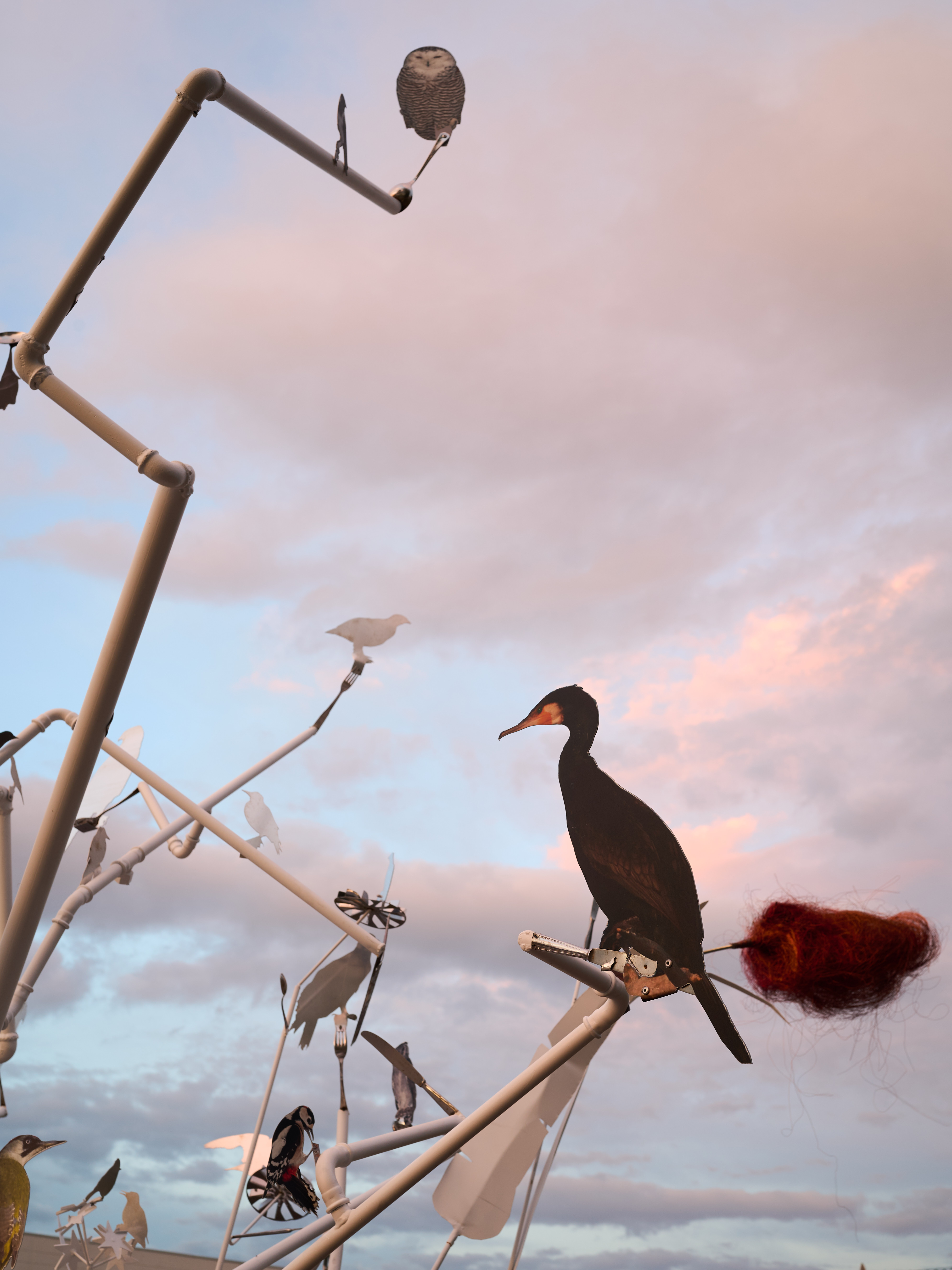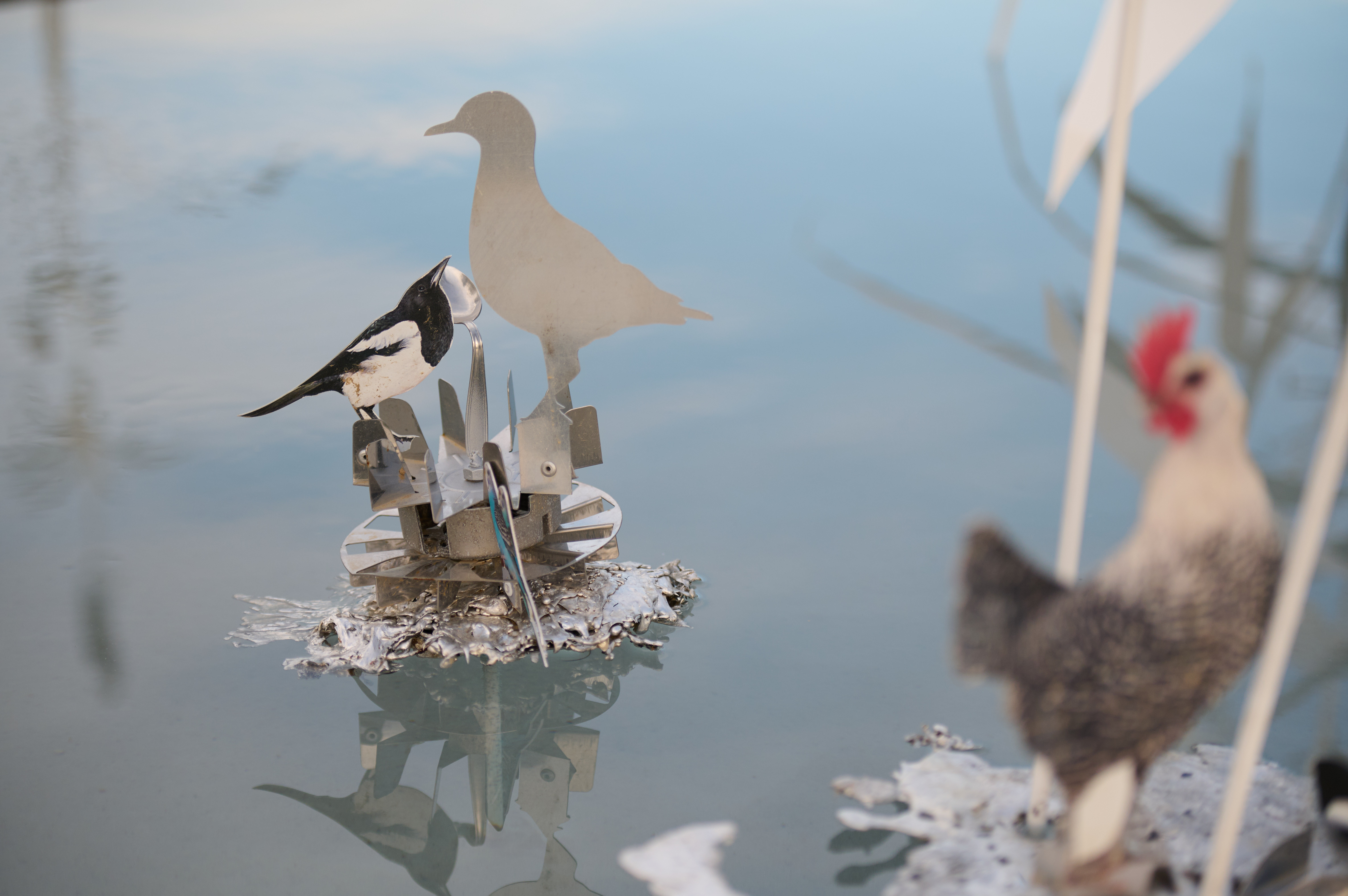 Marshy è uno specchio d’acqua di forma circolare, circa 12 metri, con tre passerelle che indicano, come mi racconta l’artista, tre caratteristiche del territorio: l’industria, la storia e la natura. All’interno di questo specchio d’acqua, un ecosistema realizzato completamente con materiali di risulta provenienti dalle aziende, ecosistema che consta di arbusti e oltre 200 volatili, scelti dagli oltre 2000 dipendenti della azienda, a seguito di un sondaggio rivolto dallo stesso artista. Anche gli uccelli, ovviamente, sono finti e realizzati tutti con materiale proveniente dalle aziende, anche se sorprendentemente reali.