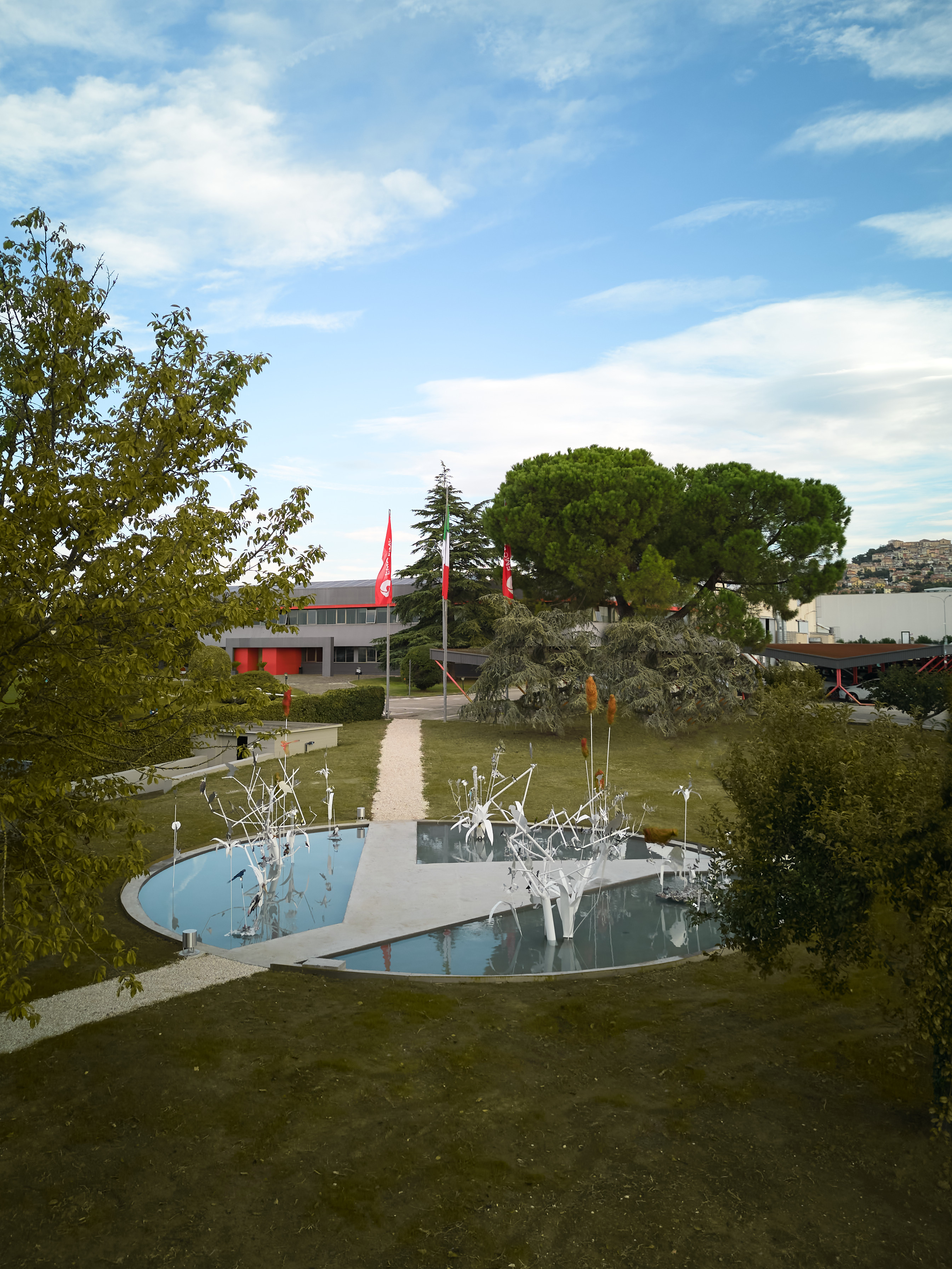 Ma andiamo per gradi, perché va detto, intanto, che l’opera è un site specific, un’opera ambientale permanente dal titolo Marshy, che in inglese significa palude, realizzata nel giardino di fronte all’ingresso della azienda EMC FIME a Castelfidardo. Tibaldi è il vincitore dell’edizione 2022 del Premio Ermanno Casoli a cura di Marcello Smarrelli. I moderni la chiamerebbero opera immersiva, qui si preferisce dire che è un’opera in cui lavorano i sensi, che restituiscono una percezione compiuta ed esaustiva. La Fondazione ogni anno affida a un artista la realizzazione di un’opera che sia permanente e che venga in qualche modo realizzata con i dipendenti.