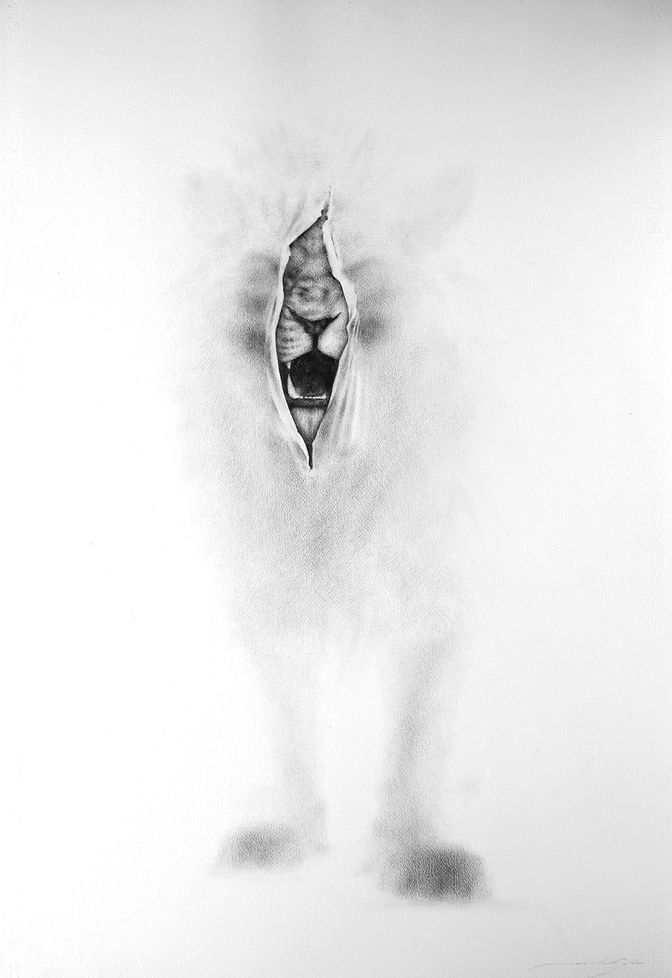 Il percordo espositivo è costituito da una serie di disegni con molti nuovi lavori realizzati per la mostra o molto recenti. In ognuno di essi si crea l’illusione di un foglio squarciato attraverso cui si svelano, in gradi diversi, animali e persone. Perché hai scelto di lavorare sull’attraverso, sul binomio svelare/celare?