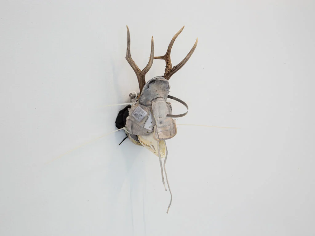 «Sono resti di cinghiale, volpe, corna di cervo, capre e uccelli, raccolti nei boschi altoatesini, innestati con cinghie e oggetti di mercato come una scarpa Nike. La questione è la combinazione: è tra la plastica d’uso consunta e l’aspetto ancestrale dei resti biologici che si crea la vertigine. Mi sono inspirato ai Luster, antichi lampadari kitch antropomorfi che si trovano in vari paesi austriaci, sospesi nei salotti o nelle case. Gli uomini si affidavano a queste figure apotropaiche per vigilare sulla pace domestica, allontanando il maligno. Siamo in un pre medioevo dove il cristianesimo non aveva ancora del tutto attecchito sulla cultura locale. Demoni per scacciare altri demoni: così nasce tutta la demonologia. Penso ai demoni arabi, a Satana, al Pazuzu. Volevo ricreare un oggetto che denunciasse ed esorcizzasse un vizio, una indigestione delle estetiche e delle tendenze».