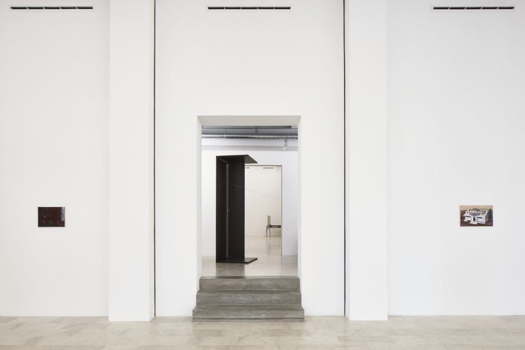 Varcata la prima sala della galleria, già negli spazi mediani degli uffici, incontriamo invece un ostacolo fisico e visivo inaspettato e oppositivo che ci ingressa al lavoro di Marie Cool Fabio Balducci (Valenciennes, 1961, Ostra, 1964). Si tratta di una scrivania ribaltata e posta in altezza che ci introduce nella seconda sala nella quale la luce, opportunamente calibrata, si propone obliqua come uscente dal lucernario.