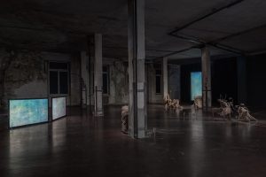 Quello che accade del resto non appena entrati, è il trasporto in una dimensione inaspettata, non immediatamente percepibile se non accingendosi alla lettura di quello che appare superficialmente come un comune pannello esplicativo. Il titolo non è quello però che il visitatore crederebbe di trovare: rendendosi conto a poco a poco di stare per intraprendere un itinerario nell’arte insolito, la sua mente si predispone all’universo che lo sta accogliendo e richiamando, con esiti di restituzione dell’esperienza differenti da un individuo all’altro. Tramite la descrizione testuale, presente esclusivamente nell’allestimento fisico, di una mostra nella mostra, continua l’incedere in un ambiente dall’atmosfera alquanto in penombra e di scoperta. Svoltato l’angolo della parete che preclude la vista d’insieme, si delinea il punto di vista privilegiato dal progetto: le sculture della recente serie intitolata I’m sitting here on the ground so I’ll remember it as a nice atmosphere’ or ‘The difficulties of a form to move away from the stereotypes it evokes invadono in maniera disinvolta l’ampio spazio espositivo, collocandosi principalmente adagiate sul pavimento e circondate da schermi che riproducono un’originale produzione di video.
