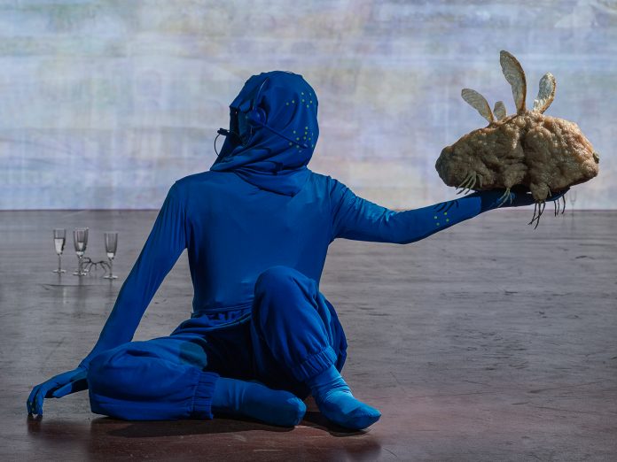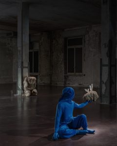 La concentrazione e l’impegno si dimostrano due caratteristiche essenziali messe in campo da chi ha concepito il percorso espositivo, quanto necessarie a chi lo intraprenderà. La presenza intorno alle sculture di piccoli, tanto curiosi e scultorei, elementi, quali i flute tipici degli eventi conviviali o le riproduzioni di insetti stecco, forzano positivamente a una visita accurata, non sempre effettivamente consueta, approdando così a incessanti rivelazioni. Nulla è lasciato al caso, come la straniante partecipazione in questa “folla” di due figure interamente vestite in blu, ma che sorreggono sculture degli stessi materiali delle altre. Volendo sfruttare la tecnica del blue screen, molto comune nel cinema, queste sculture non starebbero altro che fluttuando nell’aria, facendo svanire coloro addetti a sostenerle. Gli espedienti cinematografici sono sicuramente una nota unificante in questo allestimento decisamente riuscito: la peculiare narrazione che si avvale di un metalinguaggio rammenta molto una sceneggiatura; i protagonisti di questa ricordano tratti soliti alla fantascienza e alle storie del grande schermo che hanno fatto sognare e immedesimare lo spettatore; inoltre i filmati sfruttano le modalità con cui il nucleo del messaggio narrativo cinematografico viene solitamente espresso, vale a dire con ambientazioni che presentano paesaggi geometrici e porzioni di luoghi evocati oniricamente. A sorprendere in questa mostra è la sconvolgente naturalezza con cui ogni sua parte è stata disposta nel contesto deputato a contenerla; l’abilità e la sinergia con cui curatori e artista sono stati capaci di lavorare è palpabile e ben evidente nei risultati ottenuti. Il monumentale locale del complesso di Manifattura Tabacchi sembra quasi scomparire e porta chi guarda a focalizzarsi totalmente sul progetto e la storia che intende raccontarci.