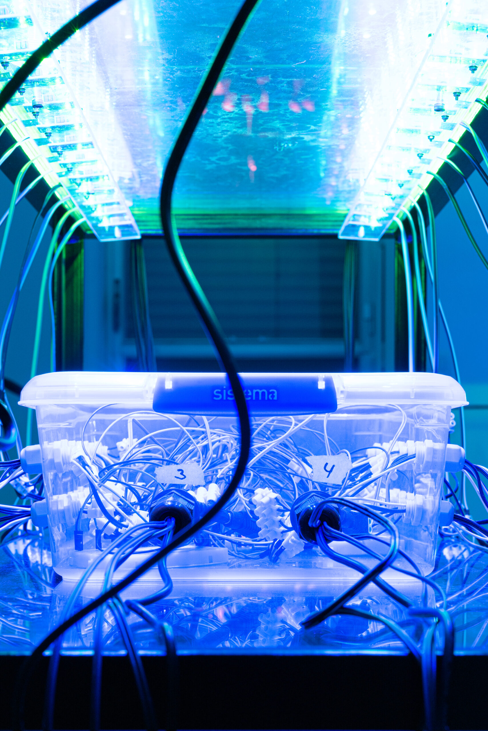 Risalendo fino a corso Sempione 33, arriviamo da MATTA i cui spazi ospitano Fishphonics: Accelerando, l’opera ambientale di Clara Hastrup che unisce elementi organici e artificiali in un sistema di acquari e strumenti musicali. Il movimento e la posizione dei pesci presenti all’interno dell’acquario attivano l’intera installazione producendo composizioni sia armoniche che dissonanti. Una volta impressionato dalle ombre dei pesci, il fotorecettore connesso a un microcontrollore, aziona due xilofoni e due metallofoni facendoli suonare. La percezione è ulteriormente complicata dal suono di tamburelli e circuiti di scatole appesi al sistema. La narrazione artistica procede per antitesi: organico e inorganico, animato e inanimato, naturale e artificiale, libertà e vincolo. La stessa luce collide con il buio, così come la melodia con il caso, ed entrambe insieme con il silenzio. Le ambivalenze conflittuali sono inebriate dalla simpatica atmosfera dei curiosi abitanti che popolano l’acquario ed influenzano l’opera.