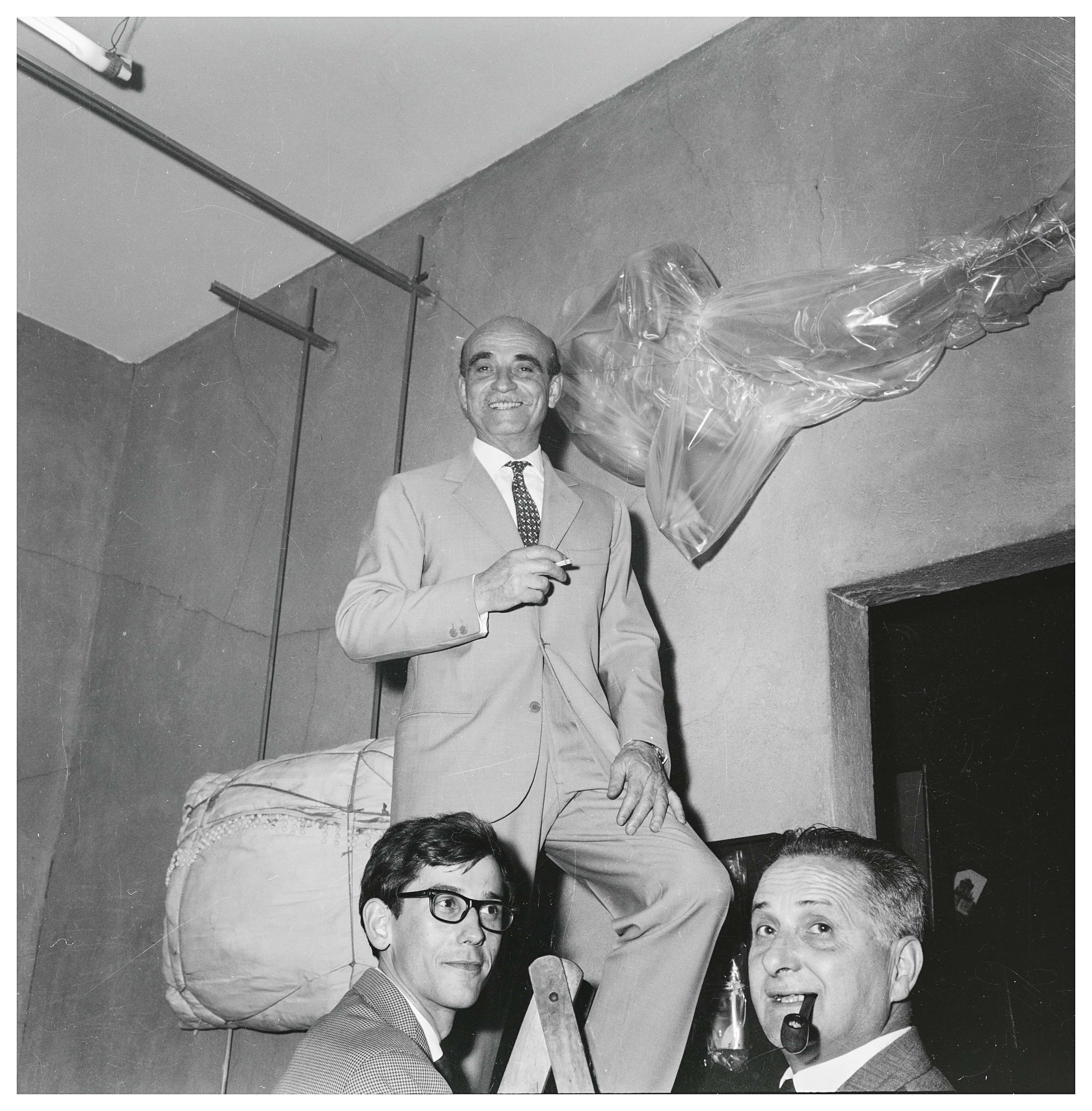 Lucio Fontana con Christo e Guido le Noci alla personale di Christo alla Galleria Apollinaire, Milano 1963. © Christo Javacheff, by SIAE 2025