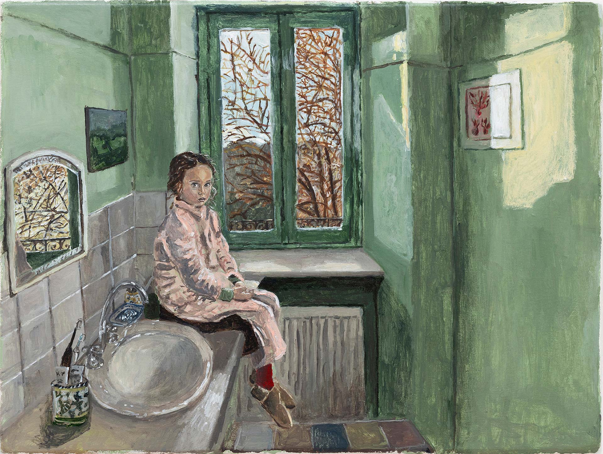 Nata a Cherkasy, in Ucraina, cresciuta a Brooklyn e attualmente residente in Piemonte, la pratica pittorica di Polina Barskaya trae origine da un archivio fotografico personale, costruito nel tempo come strumento di osservazione e riflessione. Le opere in mostra presentano interni domestici catturati in momenti di sospensione: figure sedute o sdraiate, gesti interrotti, corpi che occupano lo spazio in modo naturale, senza teatralità. In queste scene intime, l’ordinario si carica di una sottile e penetrante tensione psicologica. Le piccole dimensioni ne amplificano l’intensità emotiva, trasformando l’atto dell’osservazione in un’esperienza intima e quasi confidenziale.
