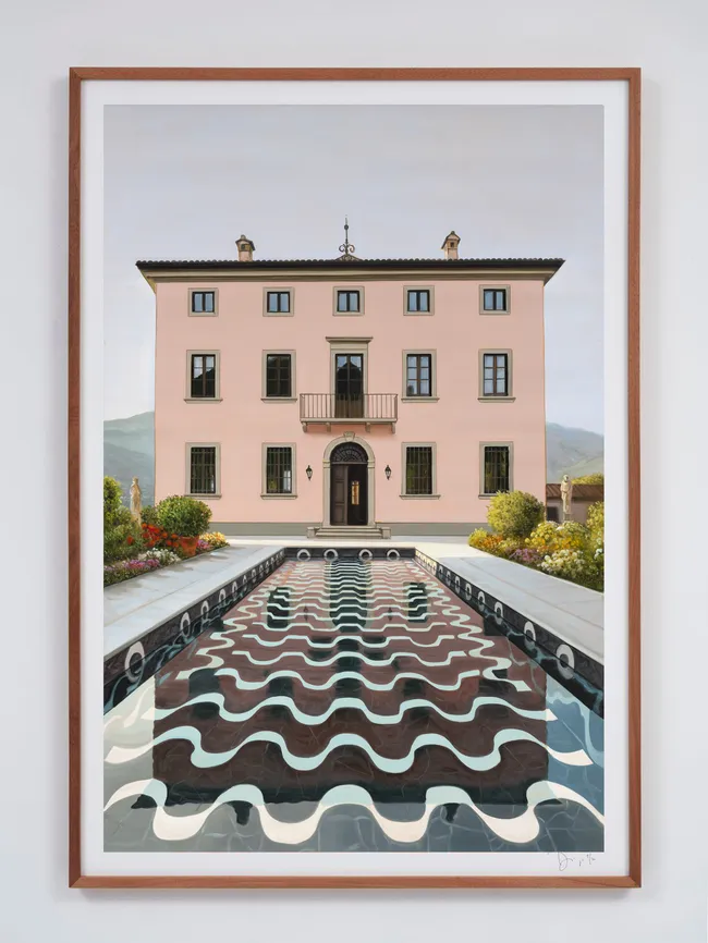 Rimanendo in zona, possiamo agevolmente raggiungere una delle sedi di Wizard Gallery – quella di via Vincenzo Monti – per visitare Cartoline d’Italia, la mostra di Diango Hernández recentemente inaugurata, che riunisce un gruppo di edizioni su carta della celebre serie Pools Olaistas, insieme a una nuova scultura in metallo che estende la ricerca dell’artista nel regno della tridimensionalità. La mostra si snoda come una riflessione sull’immaginario del viaggio, della memoria e della costruzione di paesaggi ideali. La pratica di Hernández si articola attraverso un linguaggio visivo fondato sulla distorsione, la fluidità e la trasformazione dello spazio, generando un campo percettivo sospeso tra realtà e proiezione.