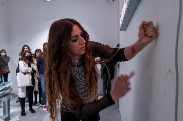 E alla fine, Loredana Longo arriva sotto la scultura-neon che recita l’errato e allo stesso tempo rafforzato messaggio “MY BODY IS NOT NOBODY”. Tra decine di sguardi increduli, l’artista inizia a graffiarsi il braccio con il suo stesso anello-punta, fino a farsi sanguinare, richiamando Gina Pane, Marina Abramović. E ricordandoci, soprattutto, che l’arte è una disperata richiesta di attenzione e che oggi, nell’epoca in cui il corpo si vuole svuotato dei suoi sensi e significati, a disposizione del potere, è urgente rimarcare un secco “NO”. A costo di scriverlo col sangue, su un muro.