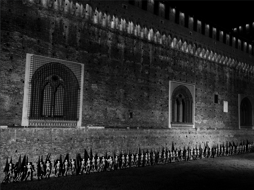 Ultima tappa di questo ultimo circuito, a conclusione anche di questa edizione della Milano Art Week 2022, ritorniamo per la terza volta alla Triennale, al Parco Sempione (M1/Cadorna), dove vi proponiamo, in prima assoluta, la proiezione del film Milano di Romeo Castellucci, filmato da Yuri Ancarani, alle ore 19:30, nell’ambito di FOG Triennale Milano Performing Arts, il festival dedicato alle più interessanti proposte nell’ambito delle arti performative. L’opera filmica in bianco e nero vede, nel susseguirsi delle inquadrature, cento scheletri che marciano per le strade di Milano in una notte di novembre. L’eloquenza muta del loro passaggio esprime ciò che non possono più dire. Hanno camminato per un’ora, percorrendo le piazze, i luoghi monumentali, i sagrati delle chiese. Gli scheletri non rivendicano nulla, se non il diritto di camminare ancora su queste strade e di ritornare in mezzo alle loro case. Il silenzio della marcia viene magistralmente interpretato dalle musiche di Scott Gibbons.